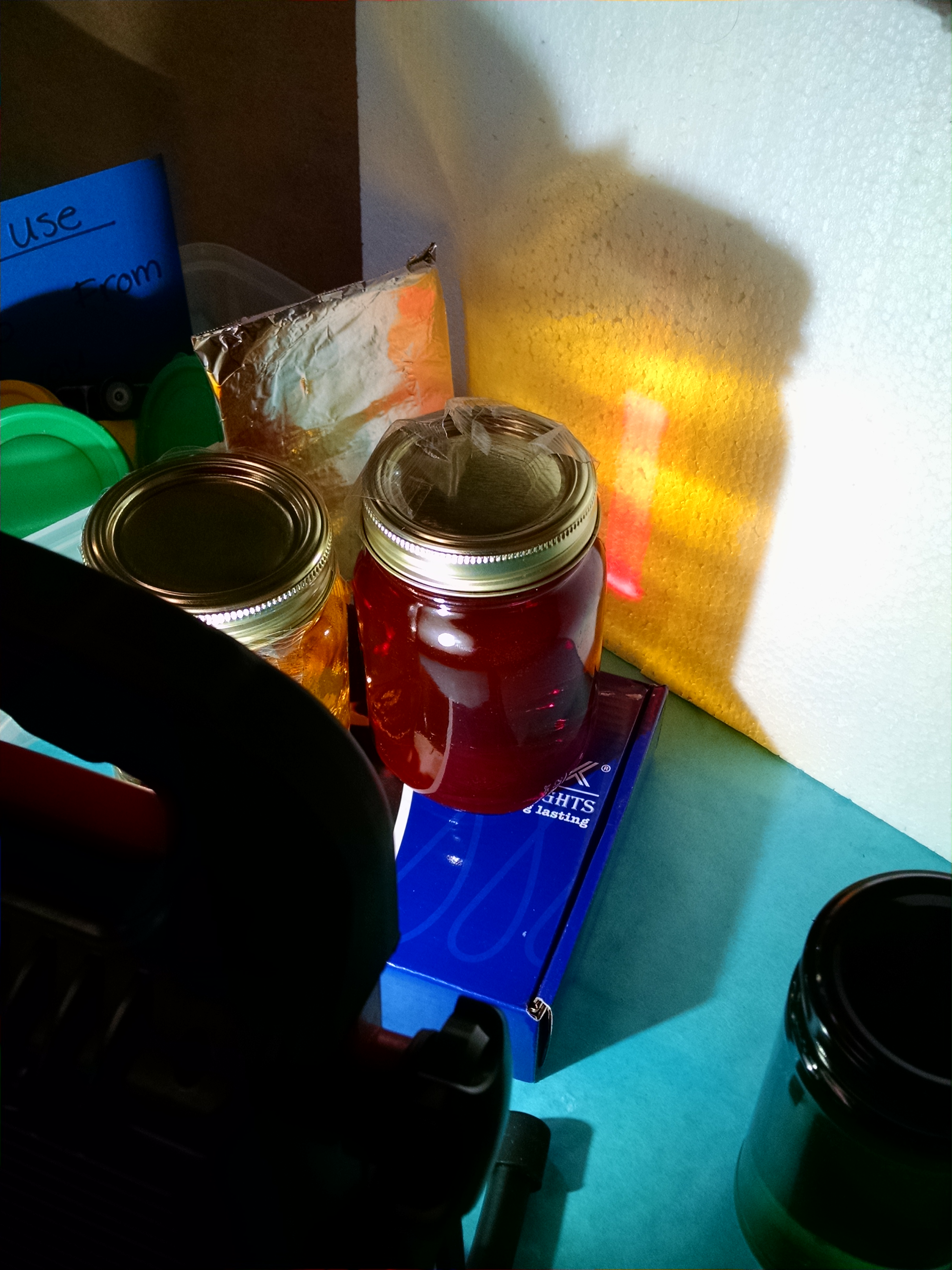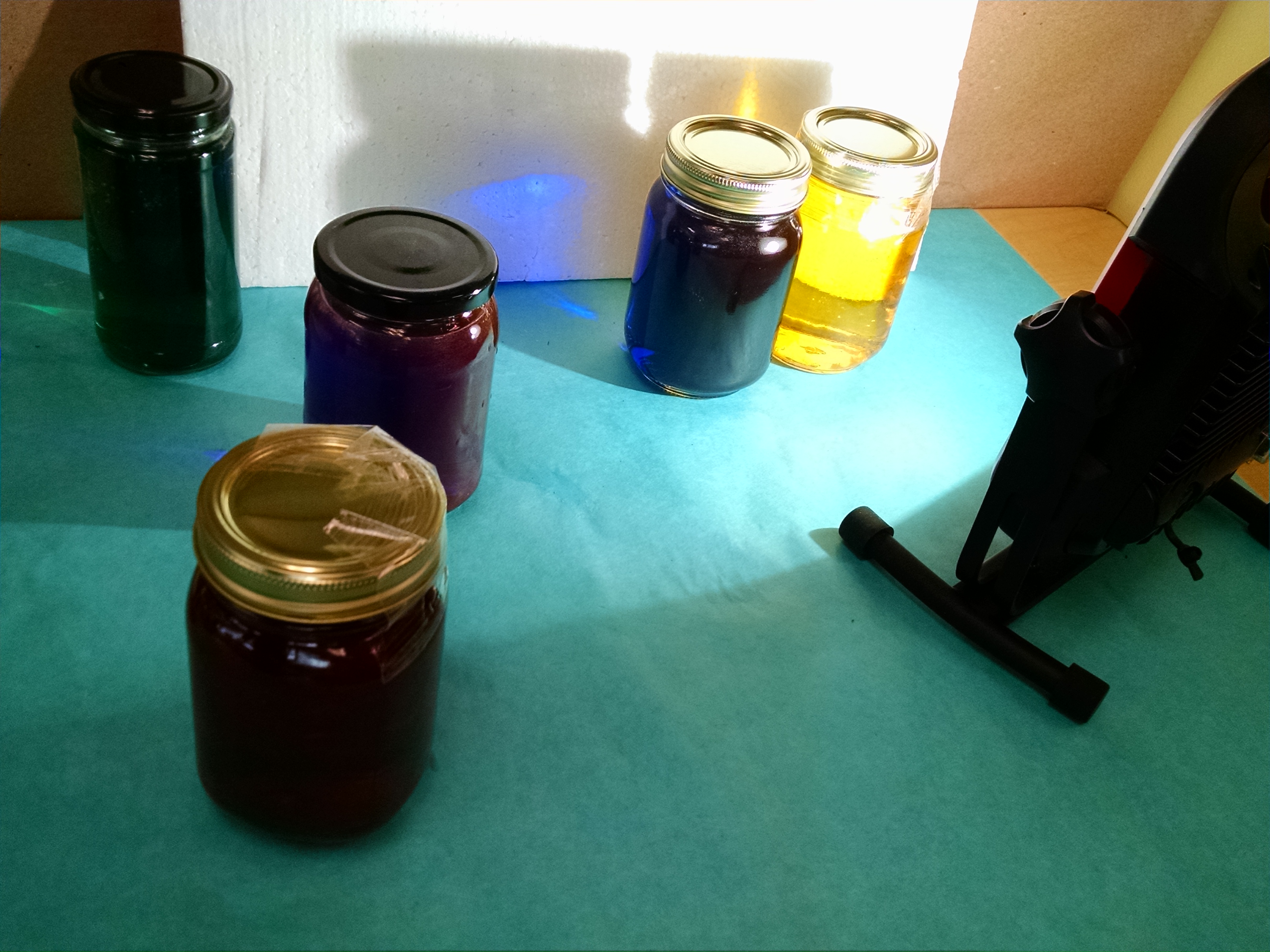 More Color and Light Exploration: We had jars of colored water and a bright light to shine through them. We rigged up a “mirror” with foil to reflect the light to “mix” colors.