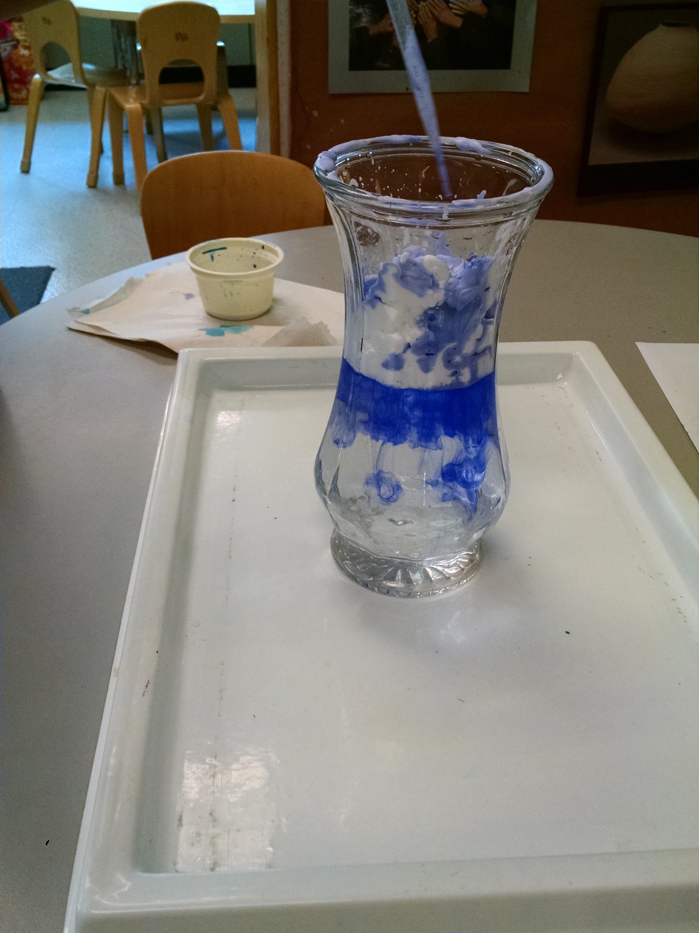 Exploration / Small Motor Skills: We “made it rain” by filling a big vase with water, spraying shaving cream on top, and using pipettes to drip diluted liquid watercolor on the shaving cream clouds. It slowly drips through, creating swirling “rainfall” below. For more pictures and thoughts on talking to kids about the science of rain, check out this post.