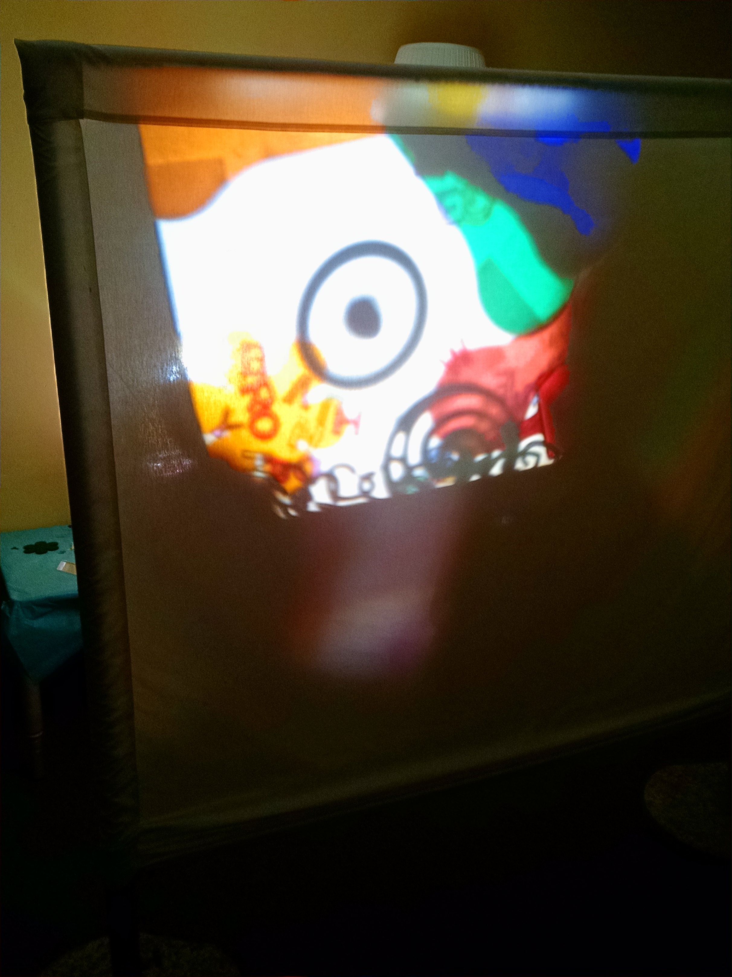 Exploration / Art: We had diffraction grating peepholes. (When you hold these up to your eye, then look at a light, the light is broken up into rainbows. Different lights produce different patterns… ambient light may create spread out rainbow colors. Looking at a ceiling light, you might see circular rainbows, an LED flashlight on a cell phone, can create six rays of rainbows radiating out. Learn more about diffraction lenses.) We had crayons / markers and paper out so the kids could draw what they saw. We also put out some kaleidoscopes and some prism viewers for them to look through. This photo is a view of our overhead projector image from above, seen through the diffraction grating: