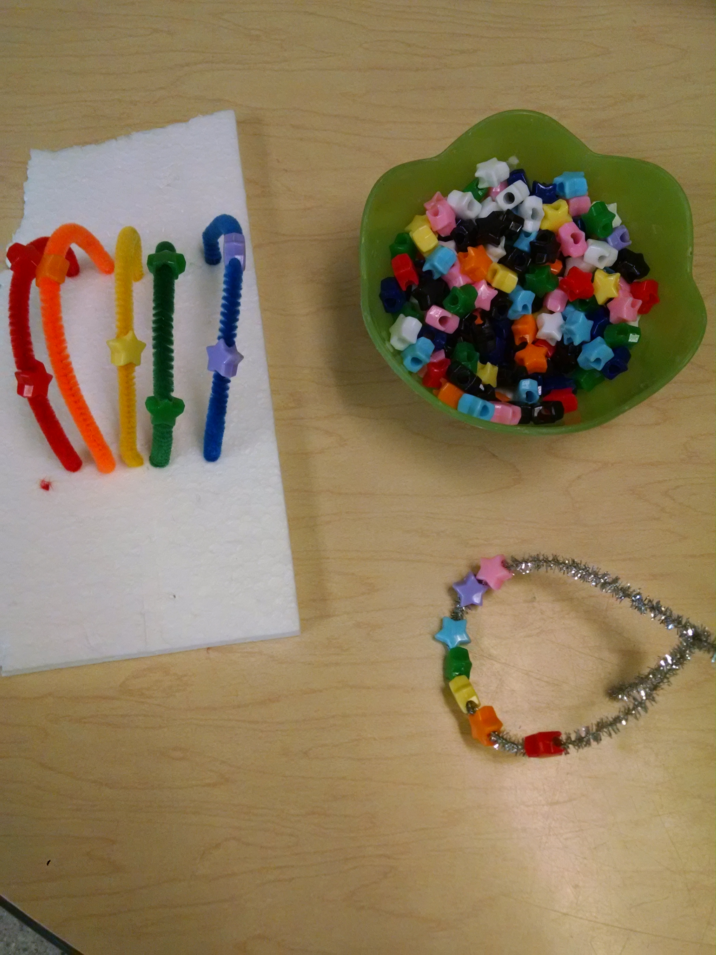 Pattern-Making / Art: We had pipe cleaners and beads out and kids could choose to make a patterned bracelet, or choose to make rainbows on Styrofoam bases.