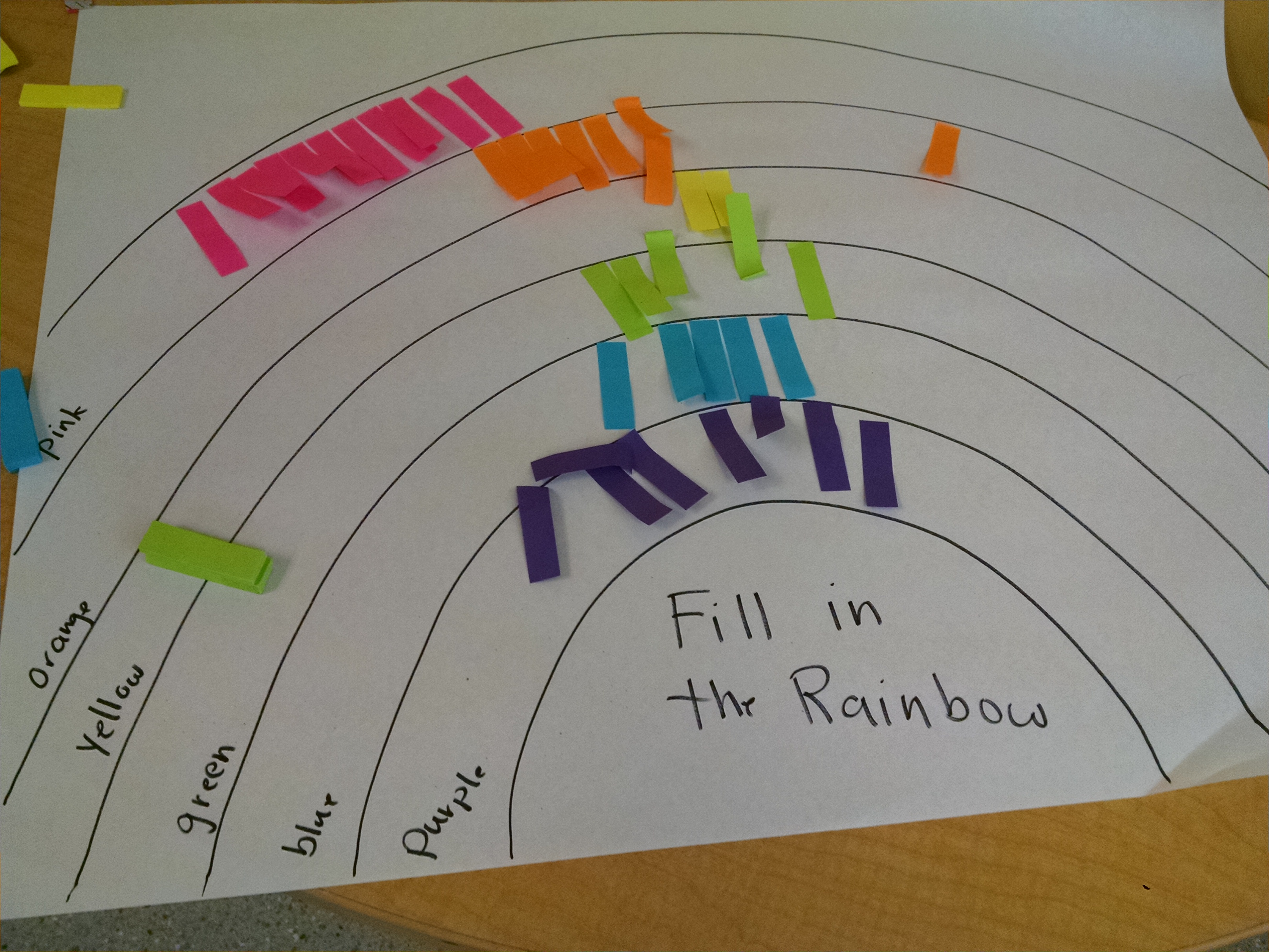 I asked the kids what colors are in a rainbow, and some could recite them easily, so we wrote those up on the board, and talk about the ROY G. BIV mnemonic.