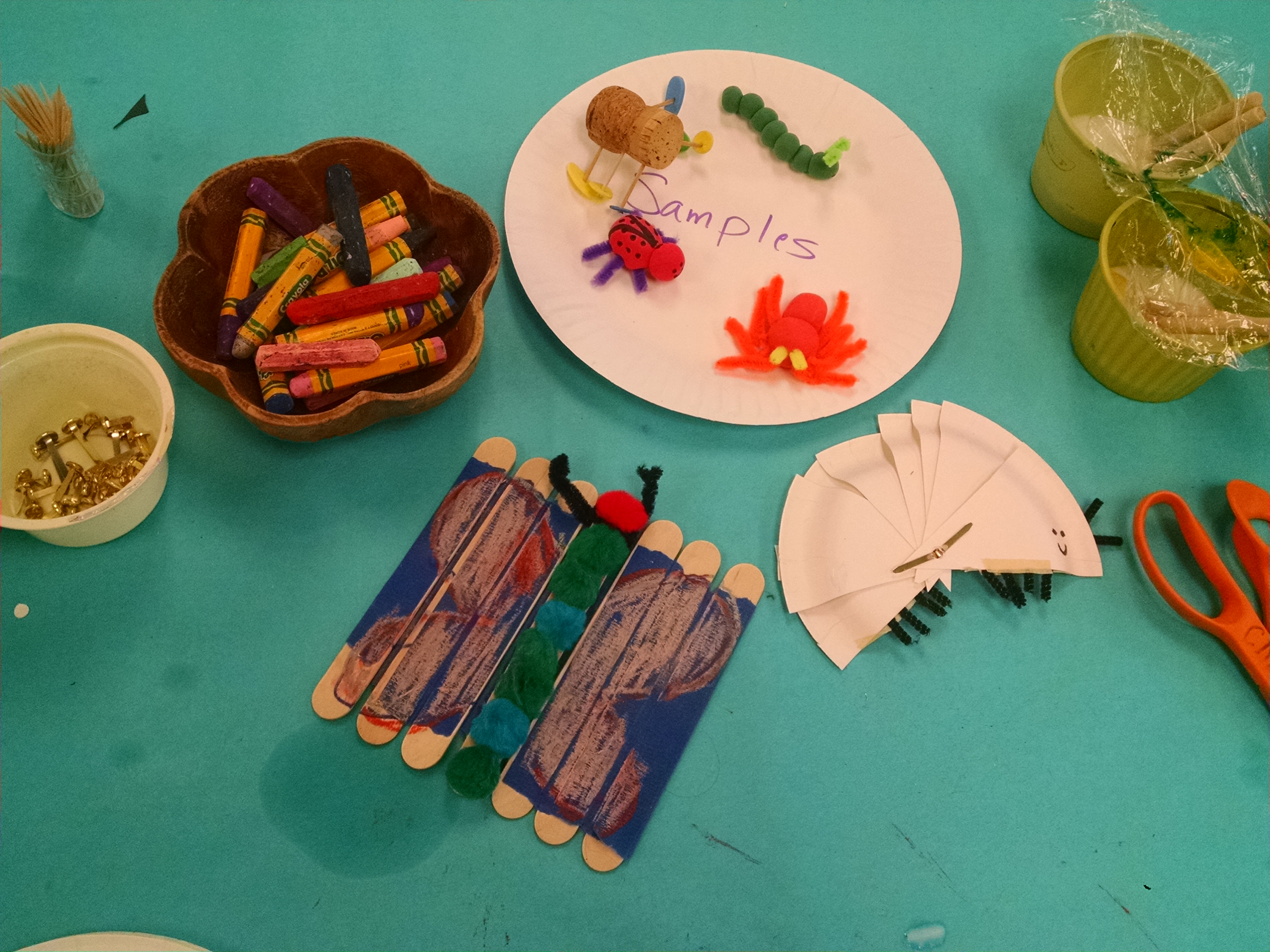 On our biggest table we set out samples of multiple different kinds of bugs kids could make, and all the materials to make those bugs or any other bug they wanted to create. It included a poster that showed anatomy of an ant and a spider and examples of a few other kinds of bugs. Our samples included: