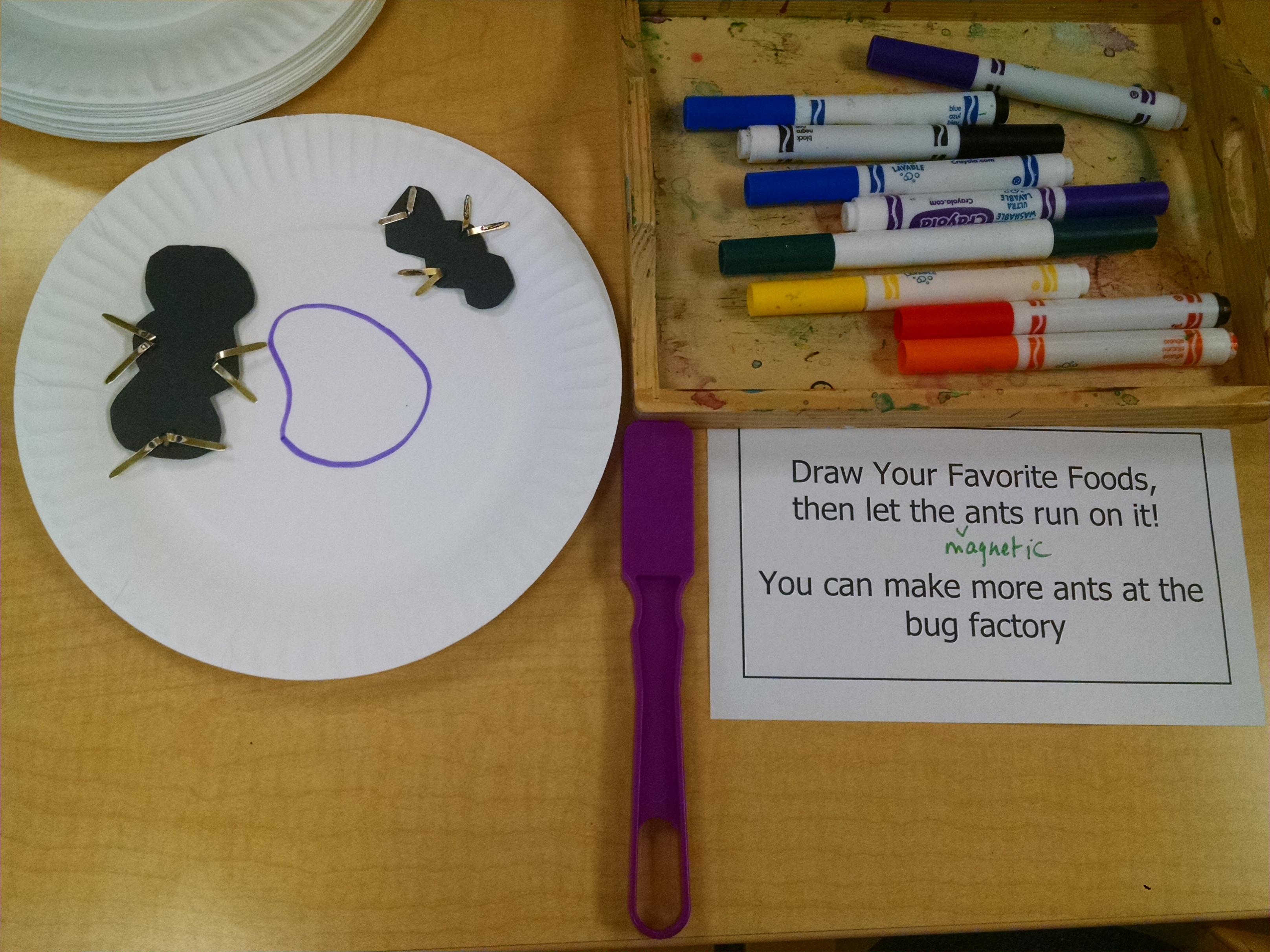 Paper Plate Picnics: Decorate a paper plate by drawing your favorite food. Then put on a magnetic ant from the bug factory. Hold a Magnetic Wand under the plate and make the ant run around on the food.