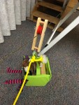 Here are pictures from class. There are more details about how to build and use these in my post on Pulley Play for Kids. In the photos, you’ll see: Fixed. The pulley is tied onto the slide platform. Child at the bottom loads a stuffed animal and pulls it up to their buddy. Compound: We anchored one end of the rope to a nail on the wall, then ran it through the bucket handle for a movable pulley then up over a spool for the fixed pulley. Block and Tackle: Here’s our block and tackle system, set up on a ramp. Basket on a Track – 2 pictures The brown cord is the track. It goes through a pulley attached to the green basket. We tied one end of the yellow rope around the basket, and the other went up to the “pulley” at the top and back down.