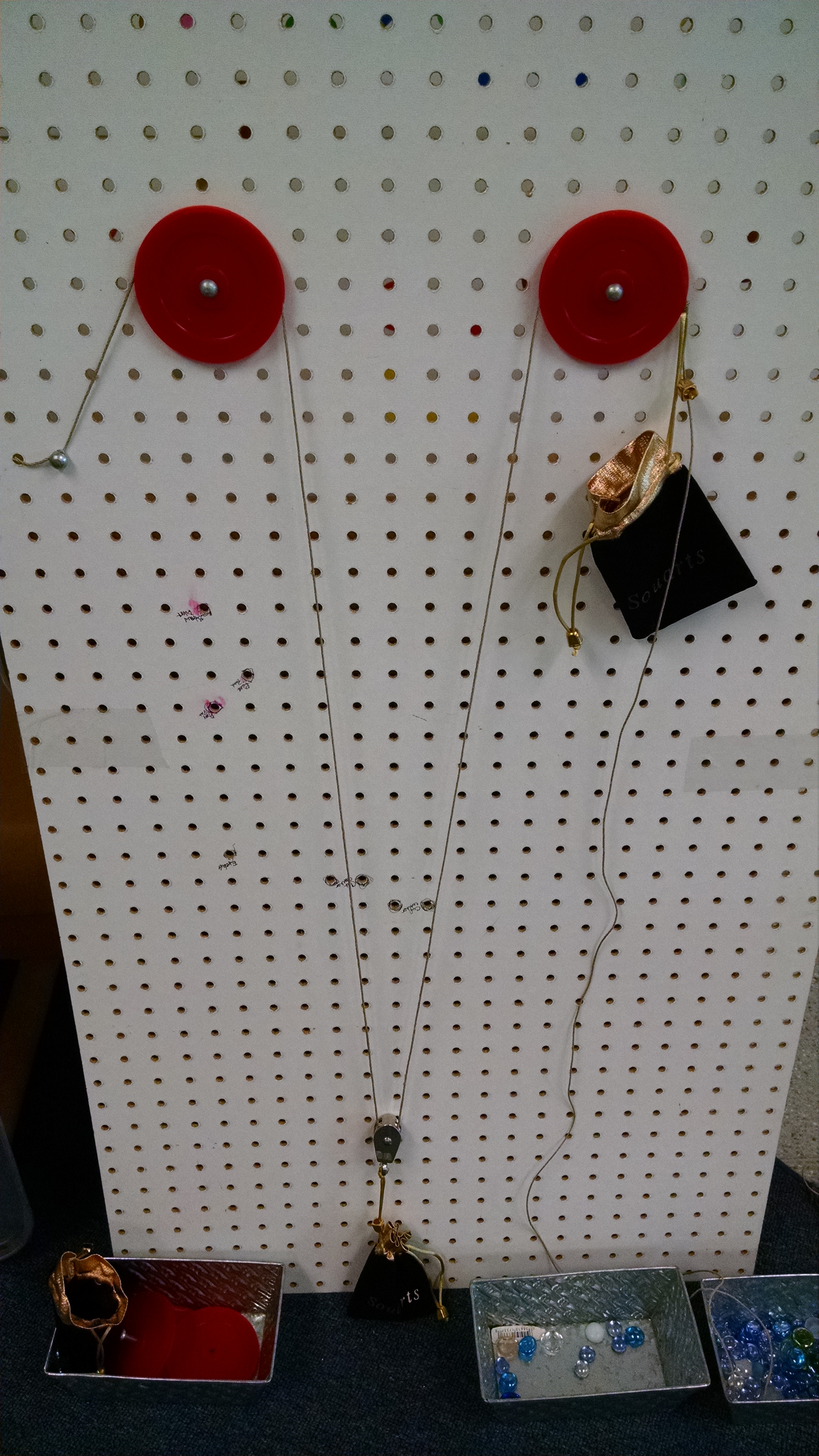 The peg board offered a build-your-own pulley system, where kids could re-arrange the pulleys and the ropes to test multiple paths. In the photo, the cord is fixed on the left, then runs over a red fixed pulley, down to a silver movable pulley tied to a pouch full of glass weights, then up and over a red fixed pulley then tied to a second pouch. Kids could load pouch #2 with stones until it was heavy enough to pull pouch #1 up. This was a great idea but harder in practice as the cord was very prone to slipping off the pulleys due to their narrow grooves. With adult assistance, it was a fun activity.