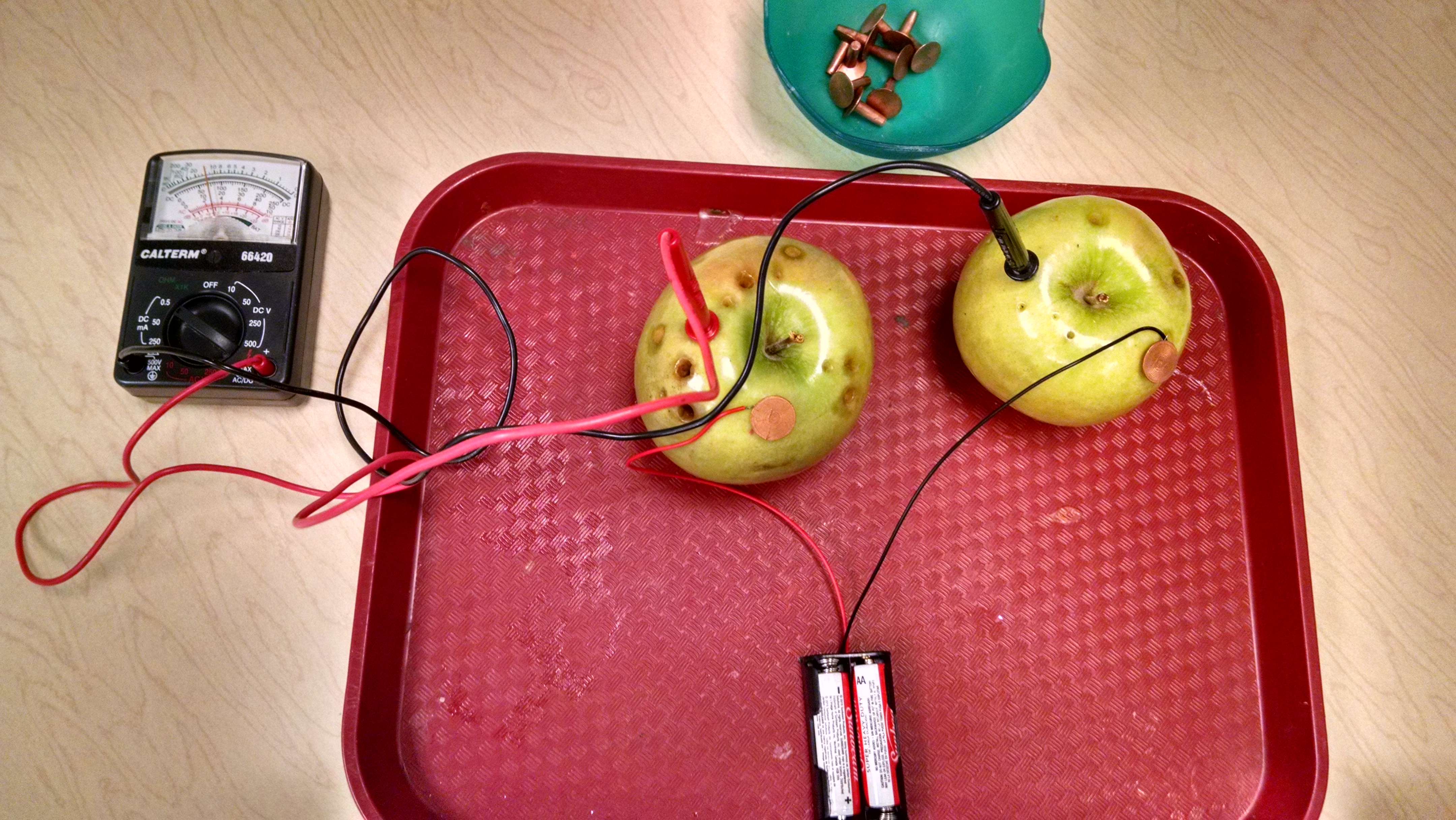 Apple Battery: Another year, we used a Granny Smith apple and copper rivets. You take a wire from the battery pack, wrap it around a rivet, and push it into apple #1. You take the other wire, wrap it around a rivet, and push it into apple #2. Then take the probes for the voltmeter and place them in the apple – be sure to put the red probe into the apple with the red wire, and the black probe with the black wire. The voltmeter will register the electrical current. Our older kids understood that the voltmeter indicated electricity was passing. Our younger kids didn’t understand that, but they liked pushing the rivets into the apple. 🙂