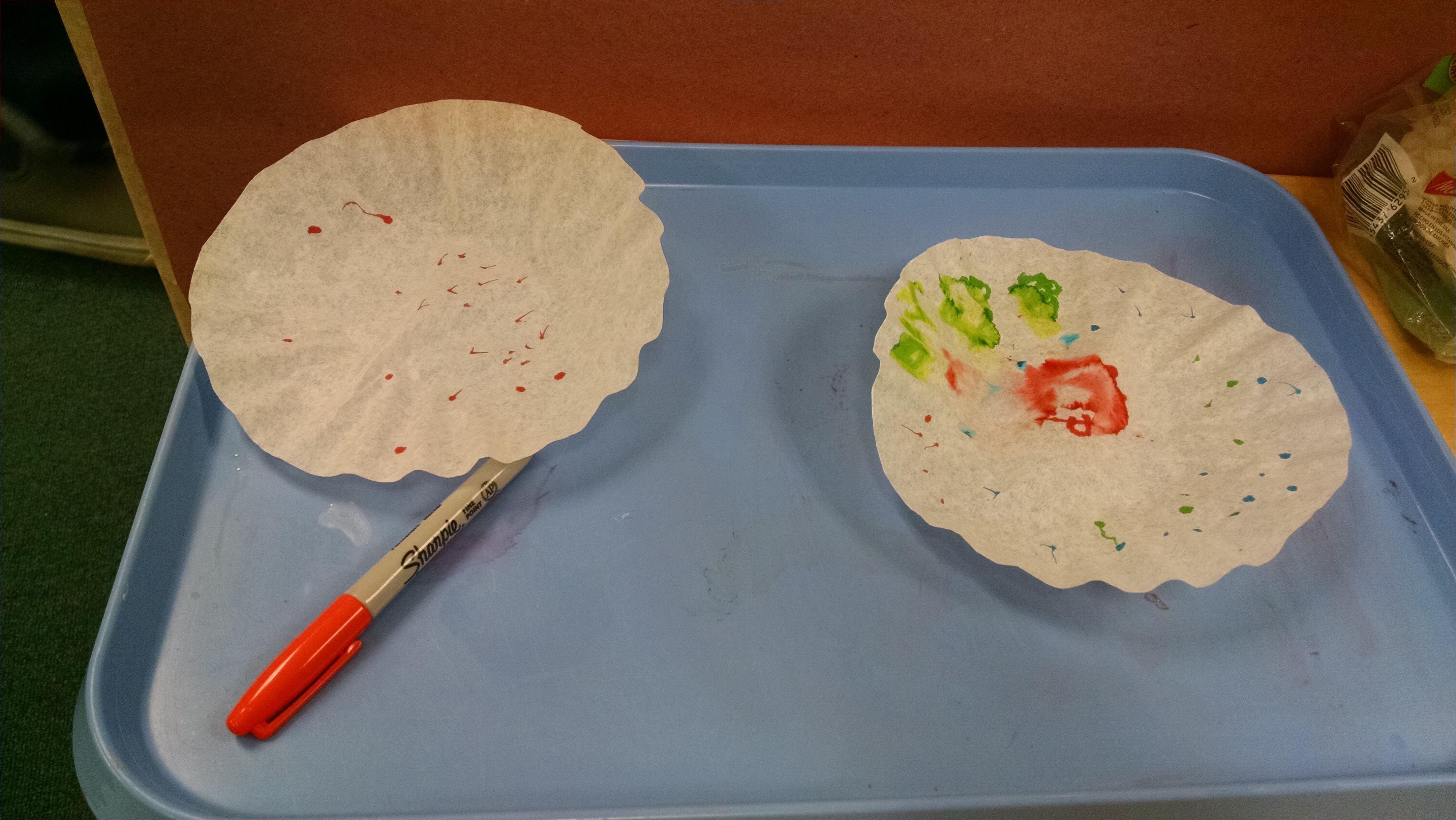 Chromatography – What color is that black marker? Supplies: strips of paper towel, various brands of watercolor black markers and small container of water. Choose a marker and draw a line 1 – 2 inches from the end of a paper strip. Dip the very end of the strip (below the line) into the water, and lay the rest of it out on the tray. It wicks up the water, bringing the color along with it. With SOME markers, unexpected colors separate out. Learn more: www.crayola.com/crafts/marker-chromatography-craft/ and http://b-inspiredmama.com/marker-chromatography-science-experiment/ www.exploratorium.edu/science_explorer/black_magic.html
