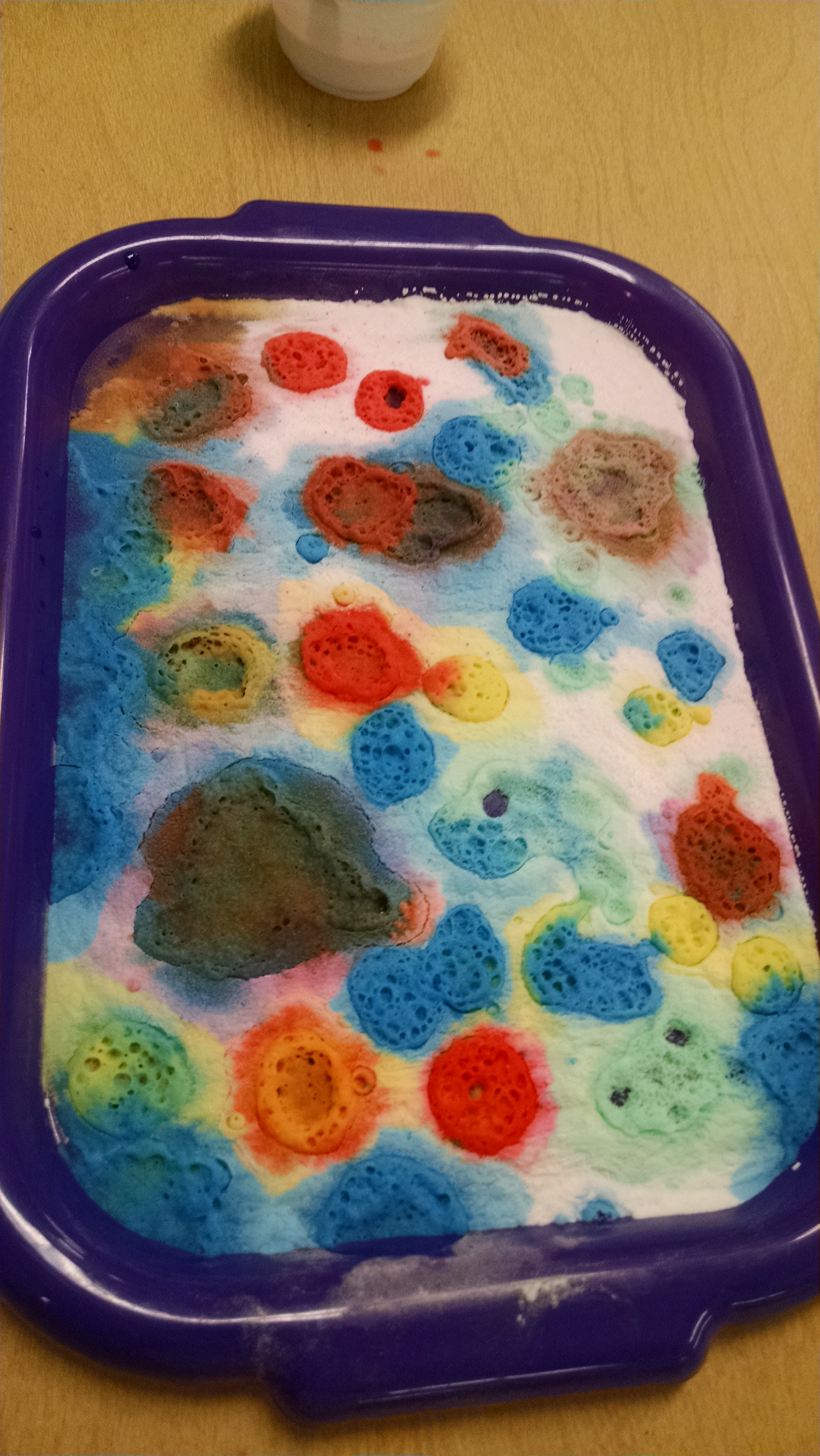 This is simple, cheap, easy to clean up, a great exposure to chemical reactions, a fun art process activity, and great small motor practice.