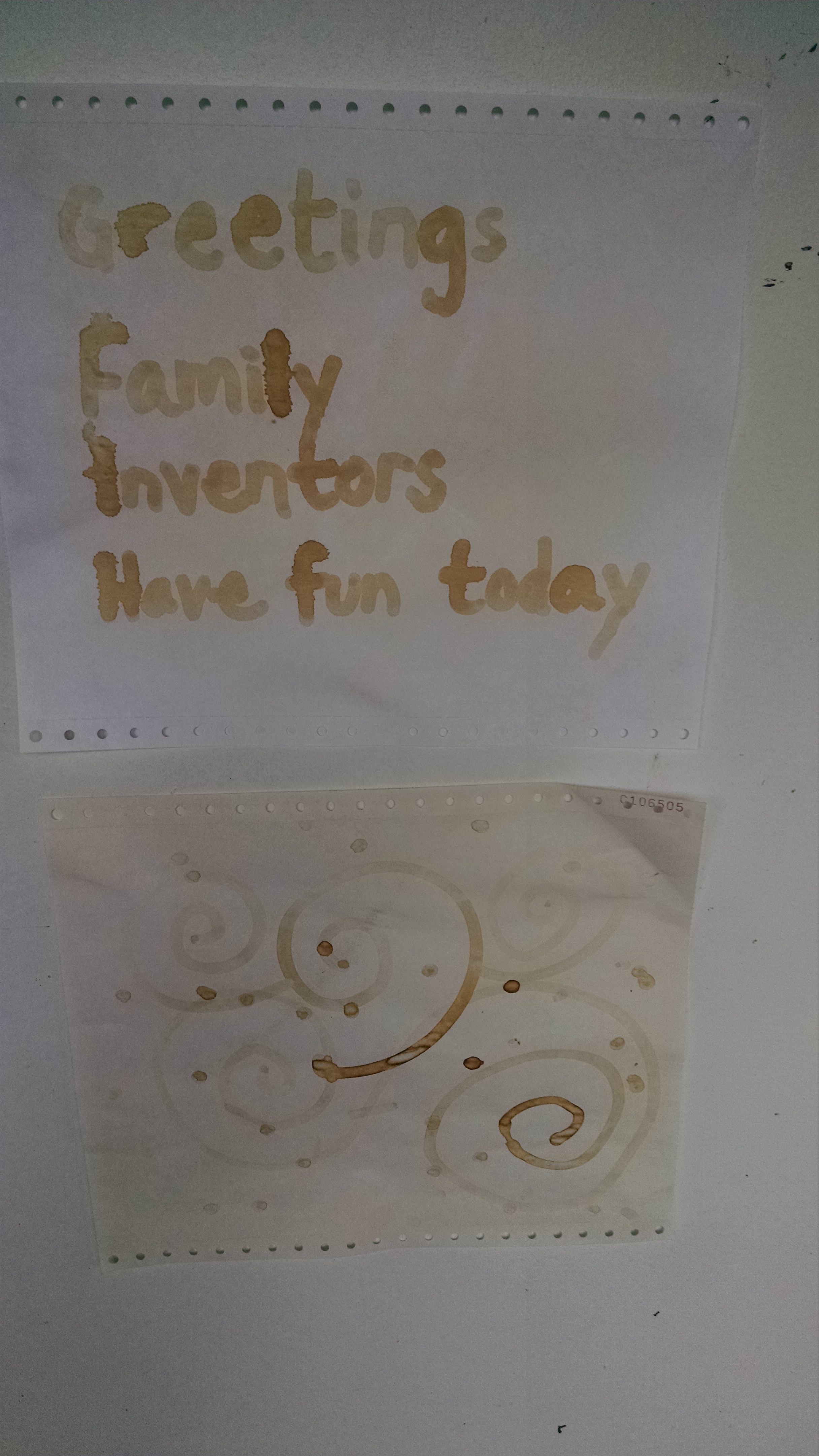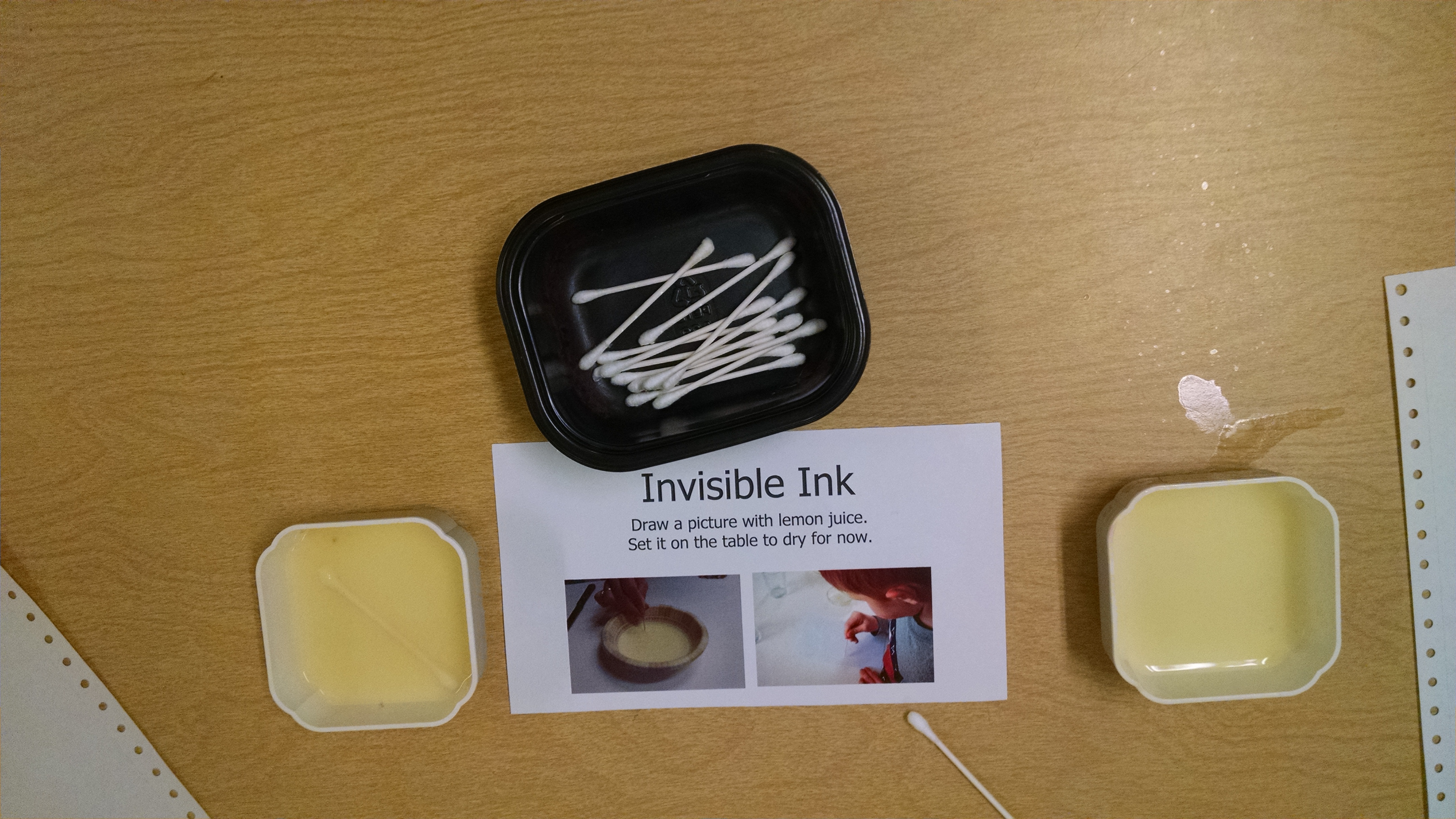 Invisible Ink: The kids used lemon juice to paint on a piece of printer paper. Then, we left it to dry. When it was dry, we asked them whose painting was whose, and what they were paintings of, as we held up what appeared to be blank papers. Then we ironed them to bring out the message. (The iron needs to be really hot.)