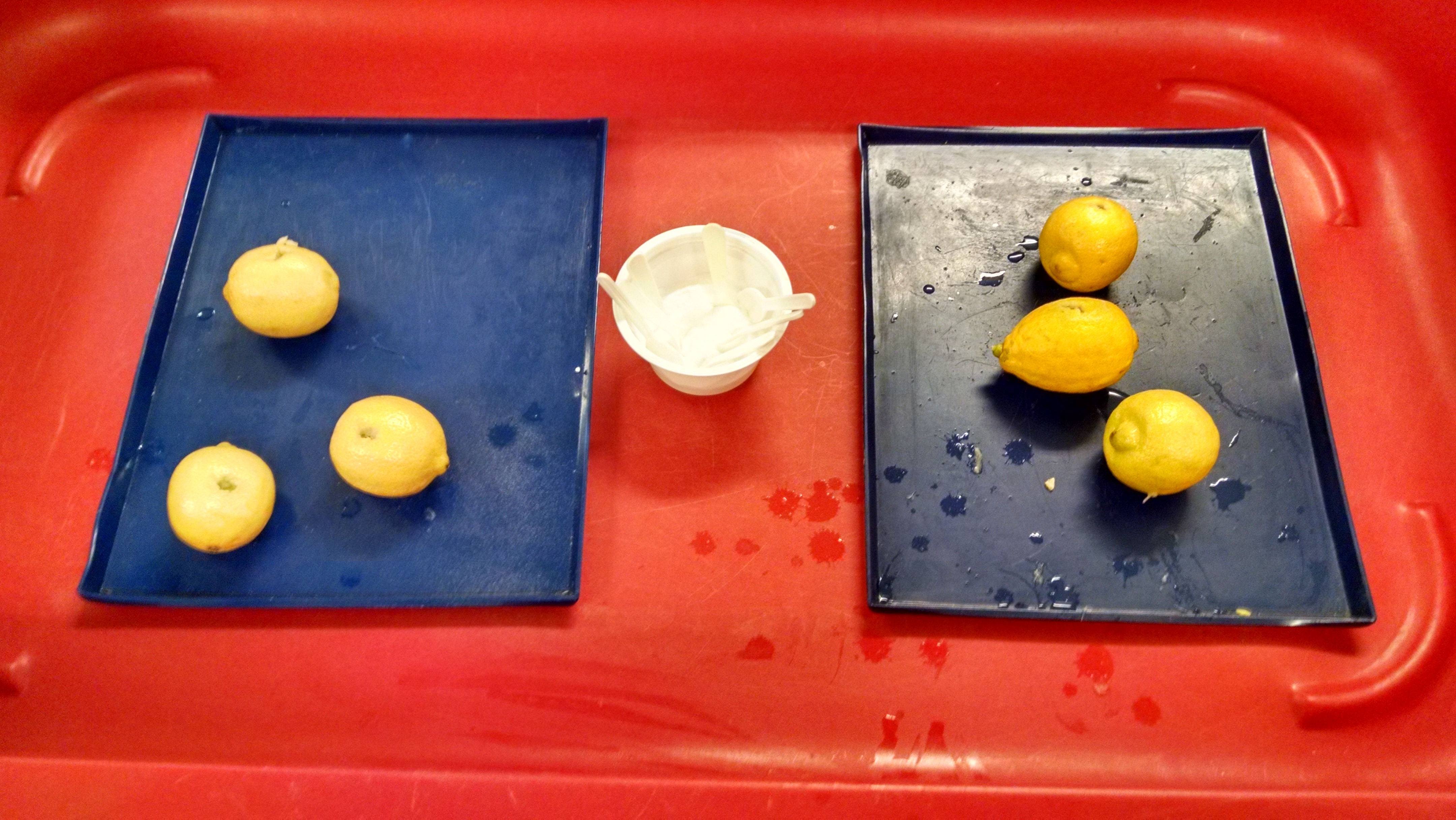 So much of this class is about messy demos. If you do all the prep in front of kids, they get bored. If you try to prep while kids are in the classroom doing activities, it’s easy to get distracted and miss things. I’ve learned the key to success is to set everything up before class. Each section of class has its own designated plastic tub, out of the kids’ sight. Each tub had its own measuring spoons and cups and everything so NOTHING needed to be moved between tubs. I did things like open and break up all the alka-seltzers in advance so I didn’t have to do it while kids waited. I had a classroom volunteer who I’d told ahead of time that when I finished each experiment, I would hand him a tub and he’d carry it away and handle all the clean-up while I went on to the next one. Here’s my list of tubs and their ingredients.
