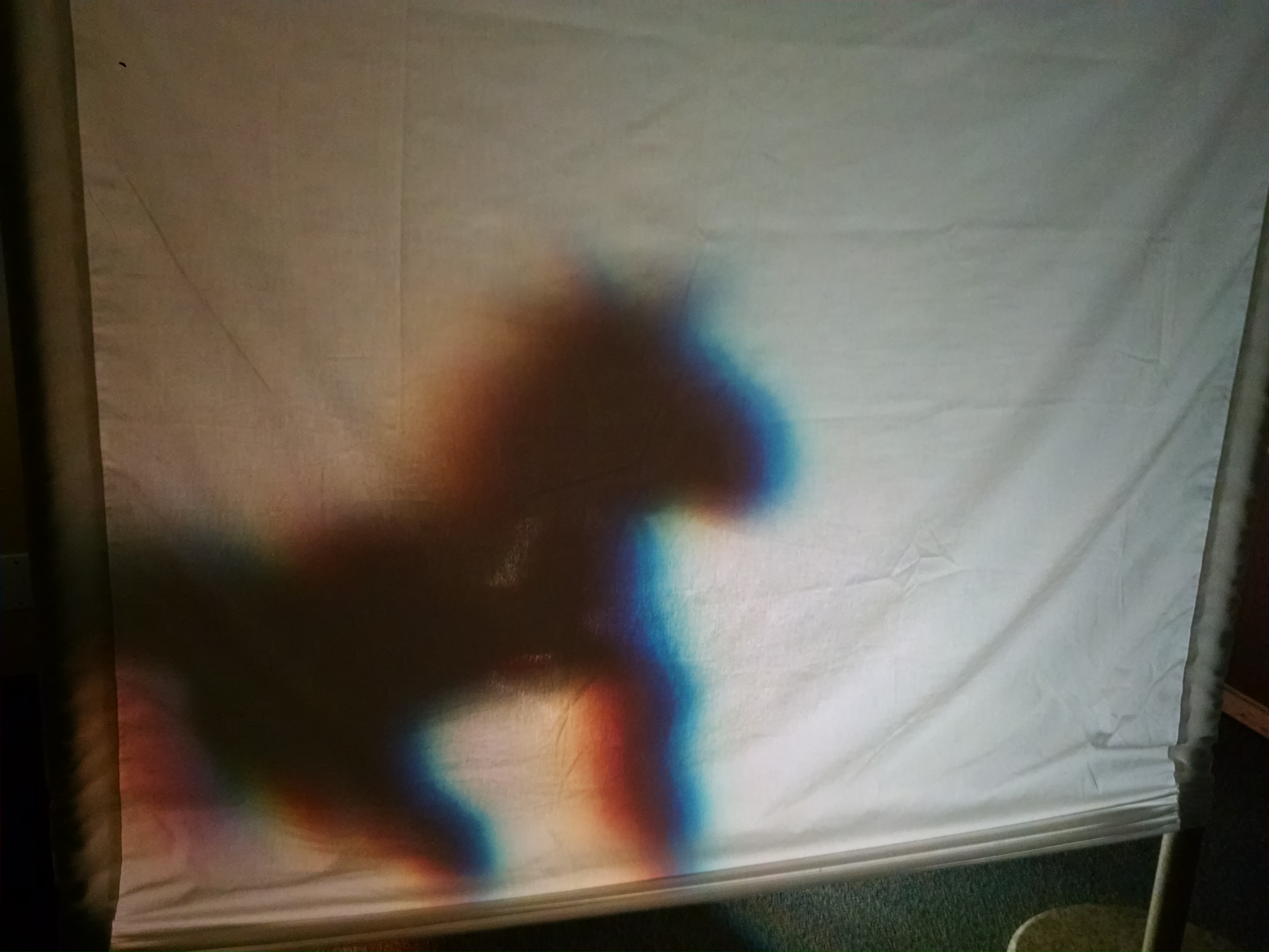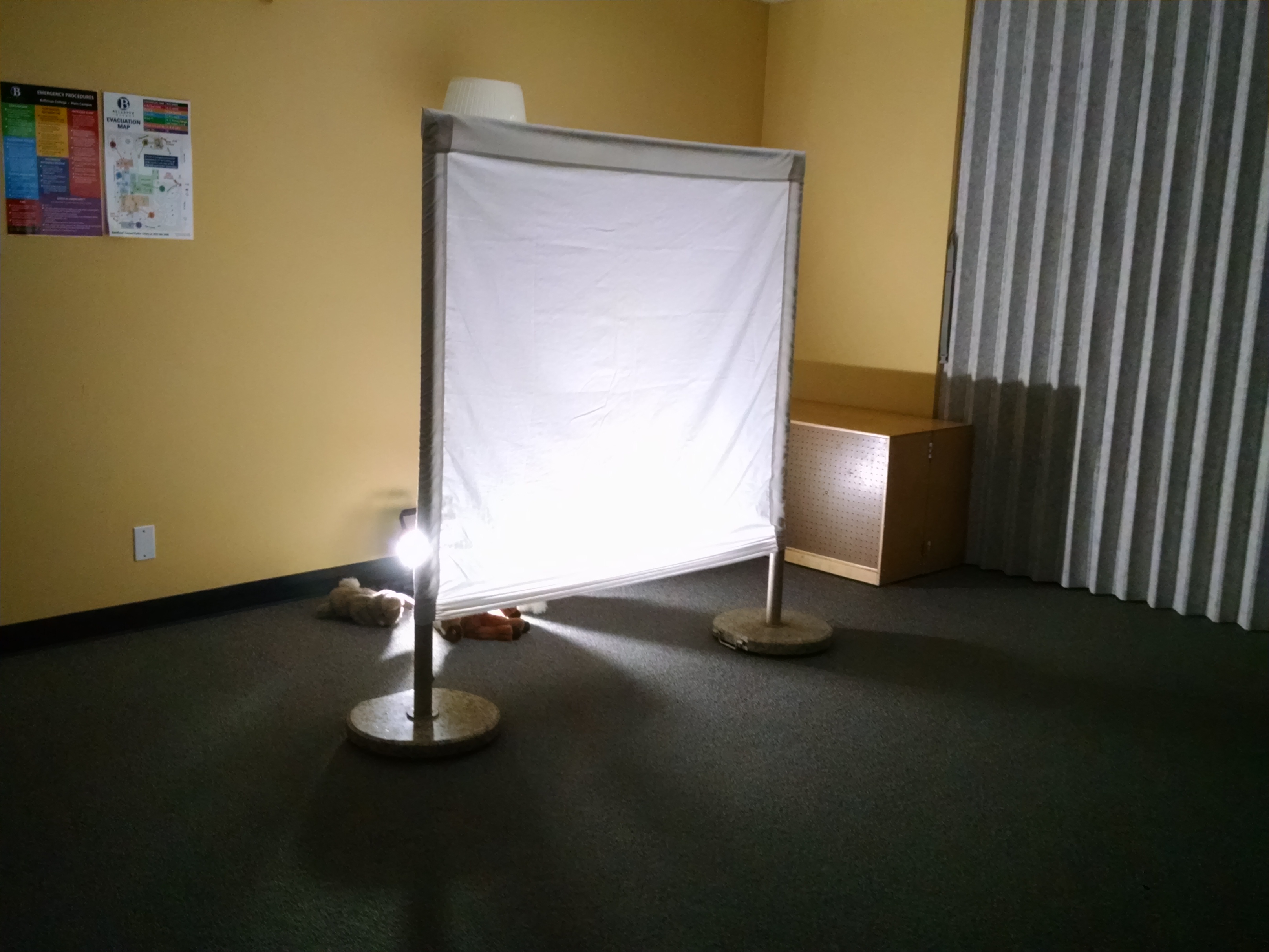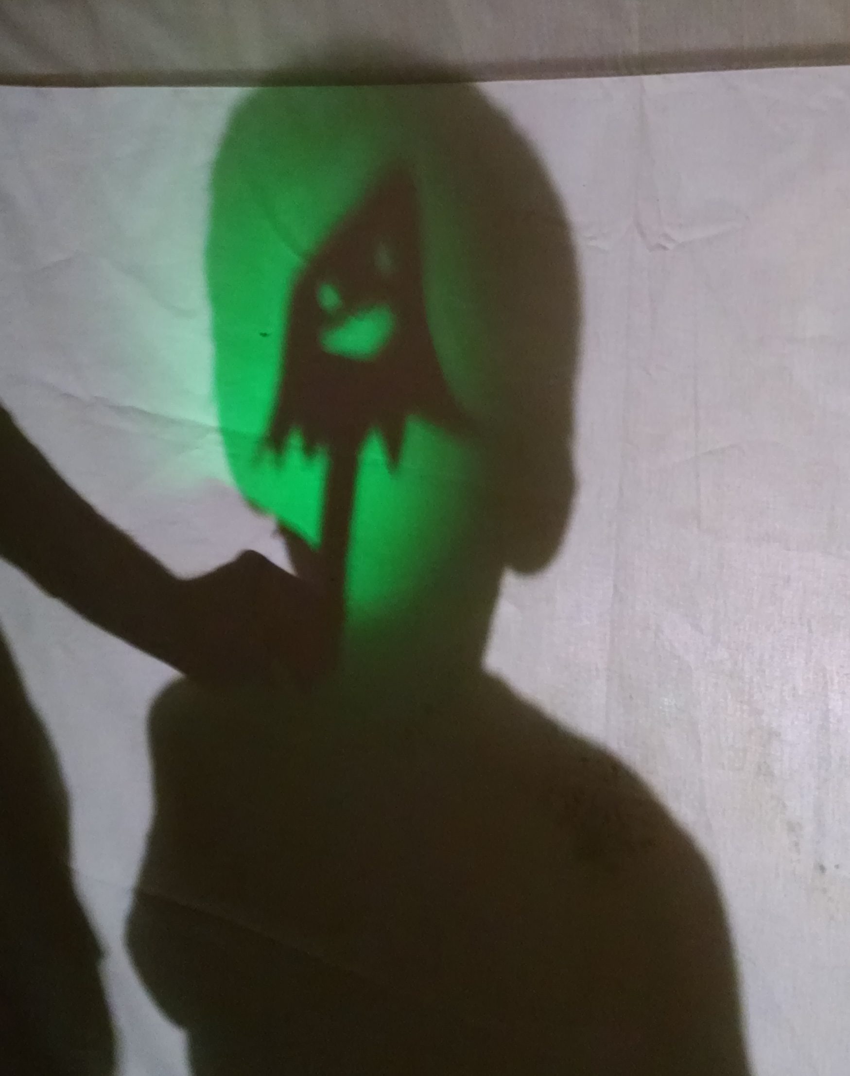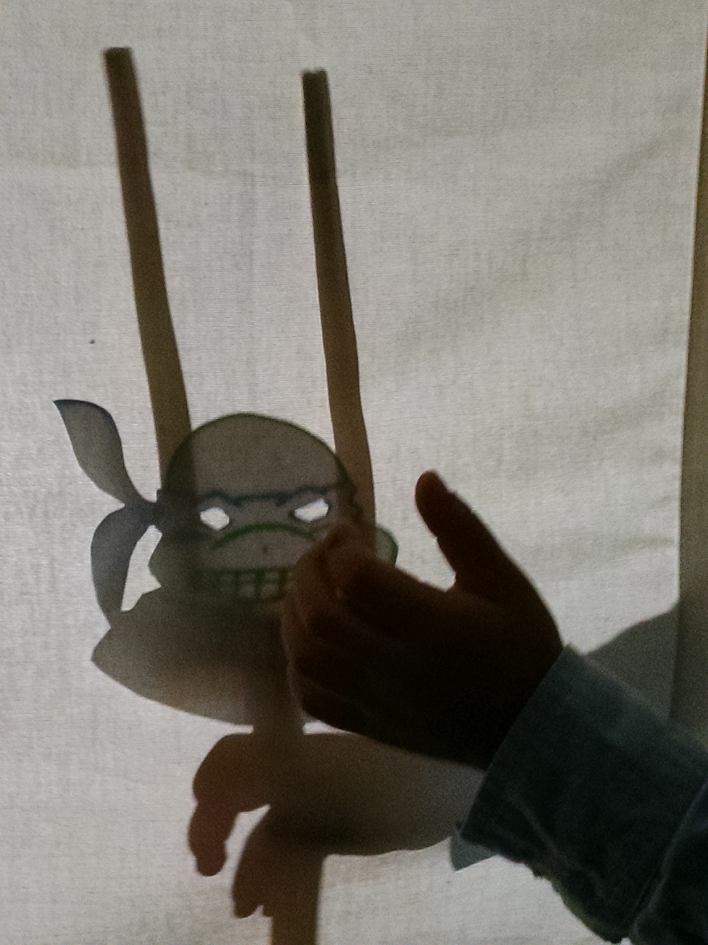 The light: Behind the screen, we use an LED Work Light, which is very bright, but cool to the touch. (PLEASE don’t use an incandescent or halogen shop light as they can get very hot!!) We happen to have an interior room with no windows, so it’s easy to get the room dark enough to get good shadow effects – it might be harder in a window-filled room.