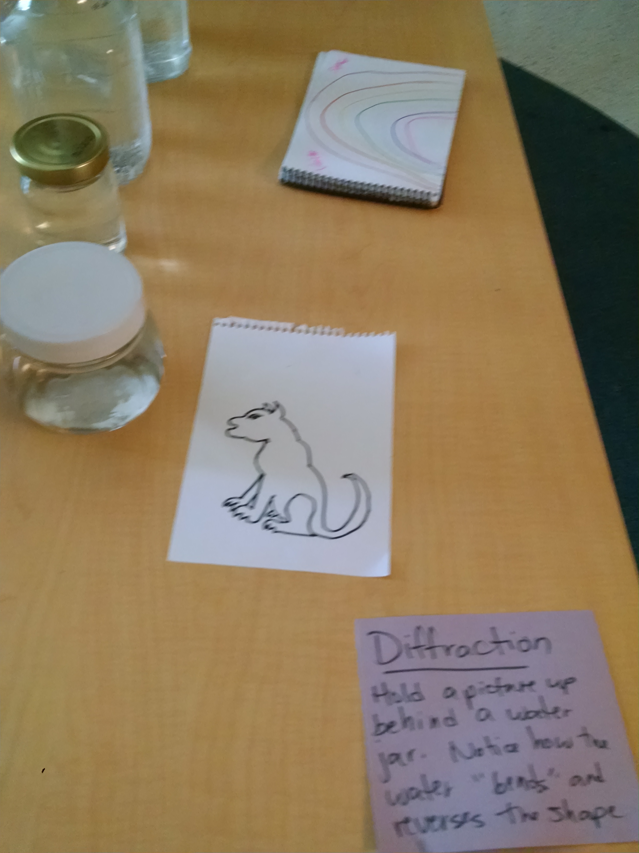 STEAM Activity: Exploring Light Refraction: Put out glass jars and containers, some filled with water, some not. Have posters with different color stripes, and an arrow. Have kids look through an empty jar at the poster. Then pour water into the jar – the image flips. Have them experiment with the different size jars, with different size drawings and moving the image closer or further away. http://gosciencegirls.com/refraction-light-glass-water-play-steam-kids/ (Note: Refraction is the light bending when it hits the water. Diffraction is light spreading out around an obstacle.) I’ll warn you – I’ve had mixed success with this activity. I’ll test it at home and it works perfectly, and I bring the exact same glass to class, and it won’t work there. I’m not sure why. 😦