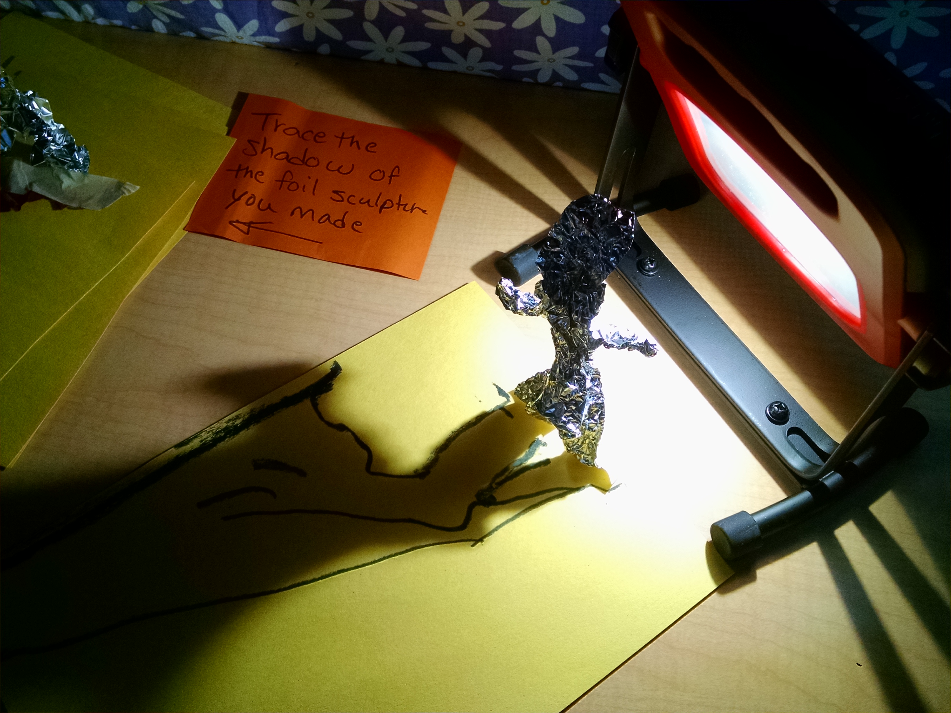This activity is best for 6 – 7 year olds. The younger ones have a harder time figuring out how to make a three dimensional sculpture. If you’re working only with little ones, you might find it better to just use plastic toys / action figures and have them trace and color in their shadows on paper. I prefer the sculpture activity where they go home with BOTH the shadow tracing AND the sculpture it’s based on, but for little ones, it was just too tricky. If you use toys, be sure to choose ones that make fun shadows!