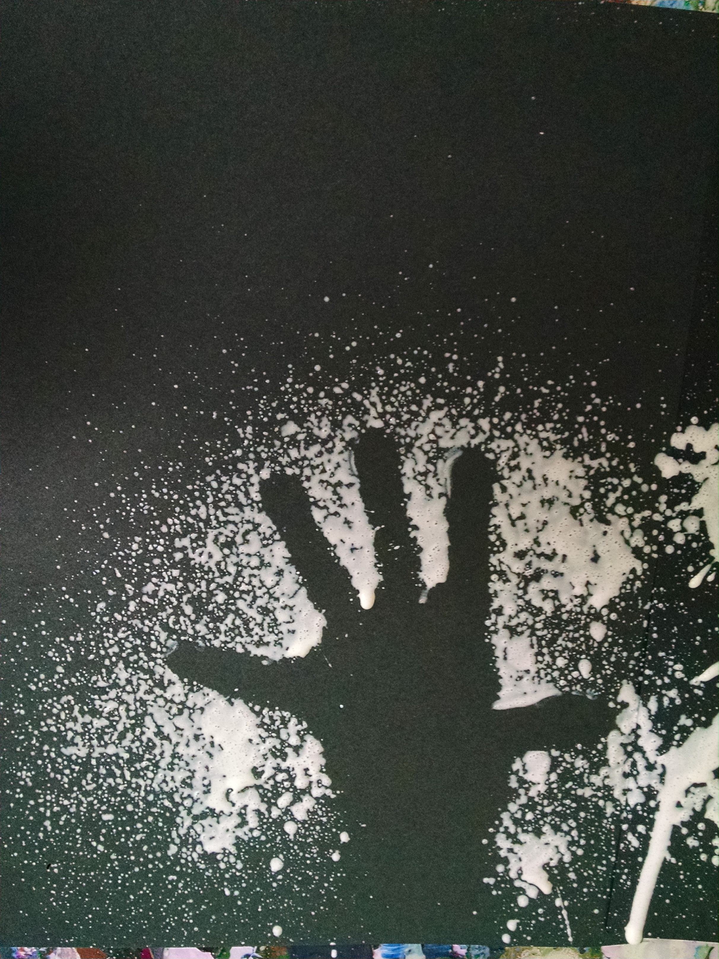 Logistics: We filled a spray bottle with white kid-safe / easy clean-up paint mixed with water… the goal was to thin it enough that it would spray easily and not clog the sprayer, but not so thin that it would run. You can either put a piece of paper on the easel, and this is a take-home project OR you can cover a whole table with paper and do a group artwork. The first year, we’d planned for the kids to do the spraying themselves (good fine motor practice) but with our sprayer, if you were too close to the paper (i.e. kid’s arm-length away), the paint stream was too focused. You had to stand back a few feet to get a nice spread-out spray of paint – and no kid could stand that far back and not make a big mess! So, we now just have an adult do the spraying. Have a tub of soapy water and a towel right next to this project so they can wash their hands right away.