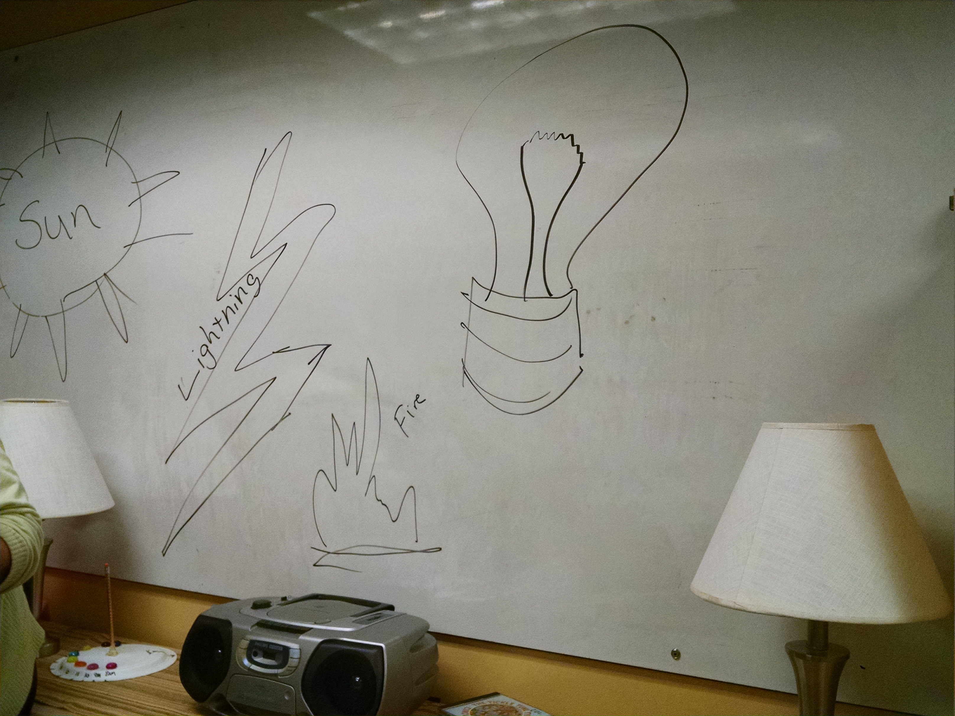 We asked the kids what makes light – what light sources could they think of. As they suggested them, we drew them up on the board to reinforce what was said.