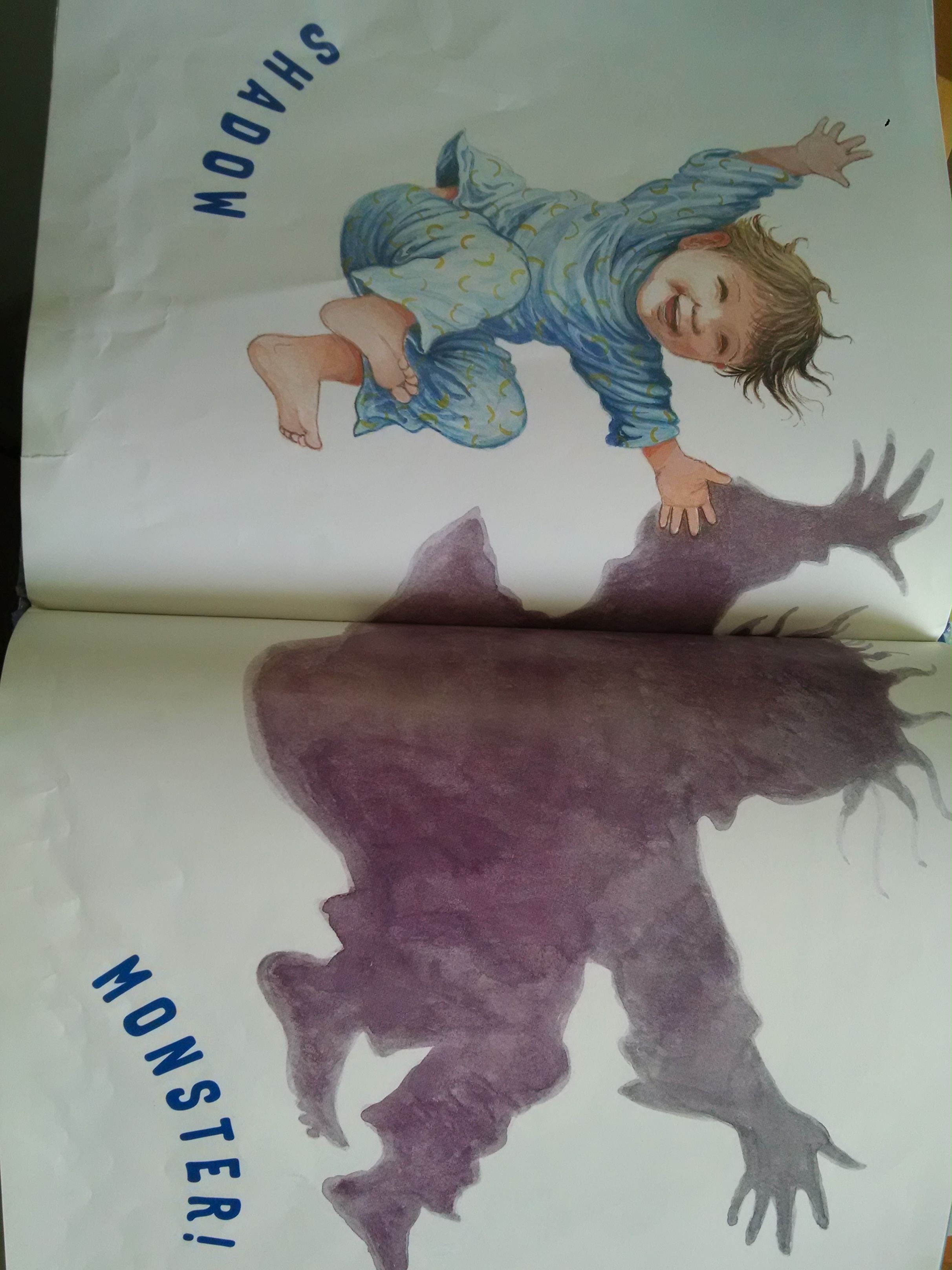 by Chorao. A boy sees shadows on his wall and is afraid that they are monsters. He yells for his parents, who come to reassure him, and end up showing him how to make shadow puppets with their hands, and then they tell a story with shadow puppets. The great part is that the book is also a tutorial in how to make those hand shadows yourself!! So, one teacher read the book where the kids could see it, and the other made the shadows on the screen for everyone to see. The book ends with the boy making shadows on the wall, including a shadow monster. Ages 3 – 7. Although it’s long for a read-aloud, it works, when used in conjunction with the shadow screen.