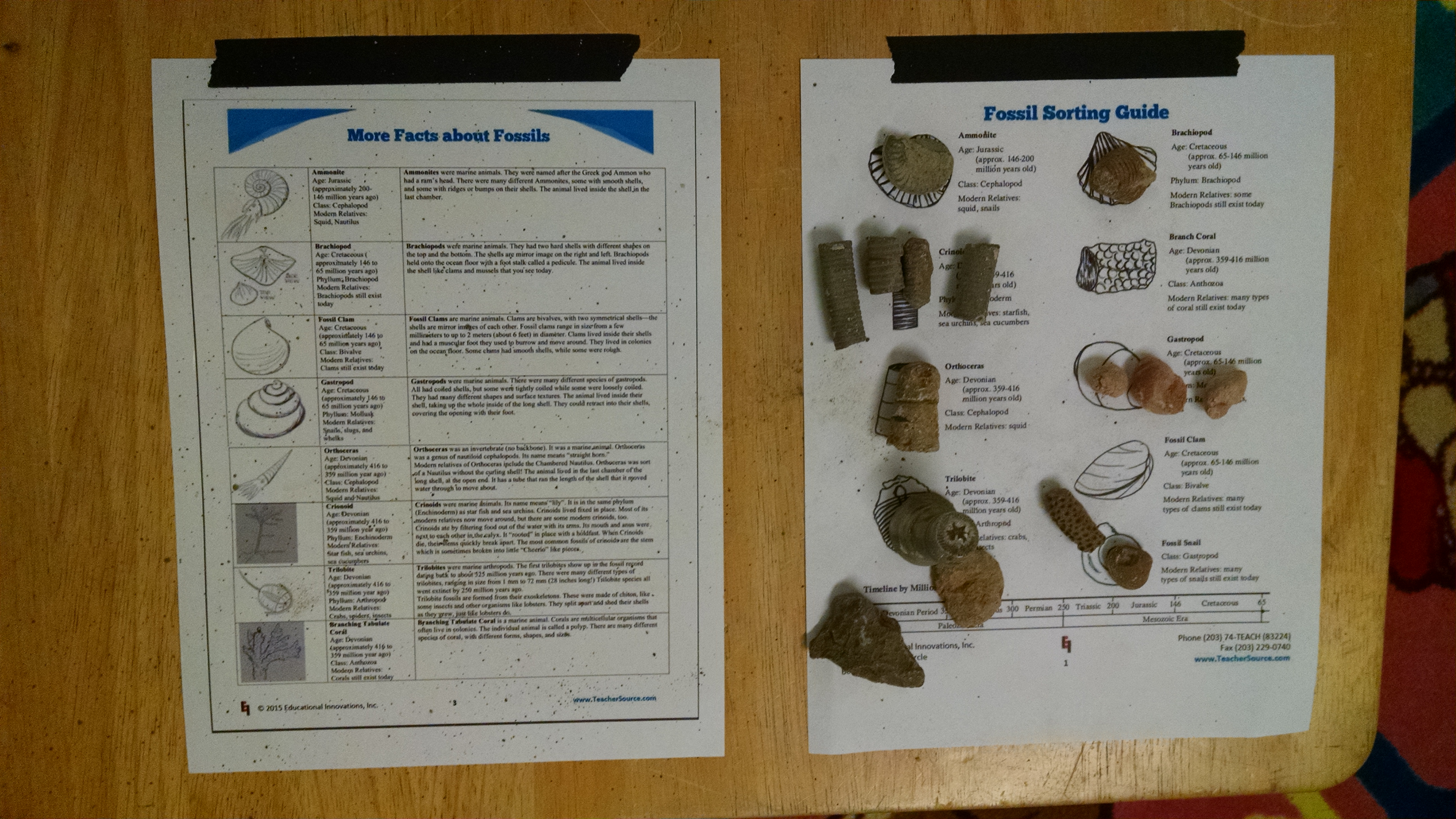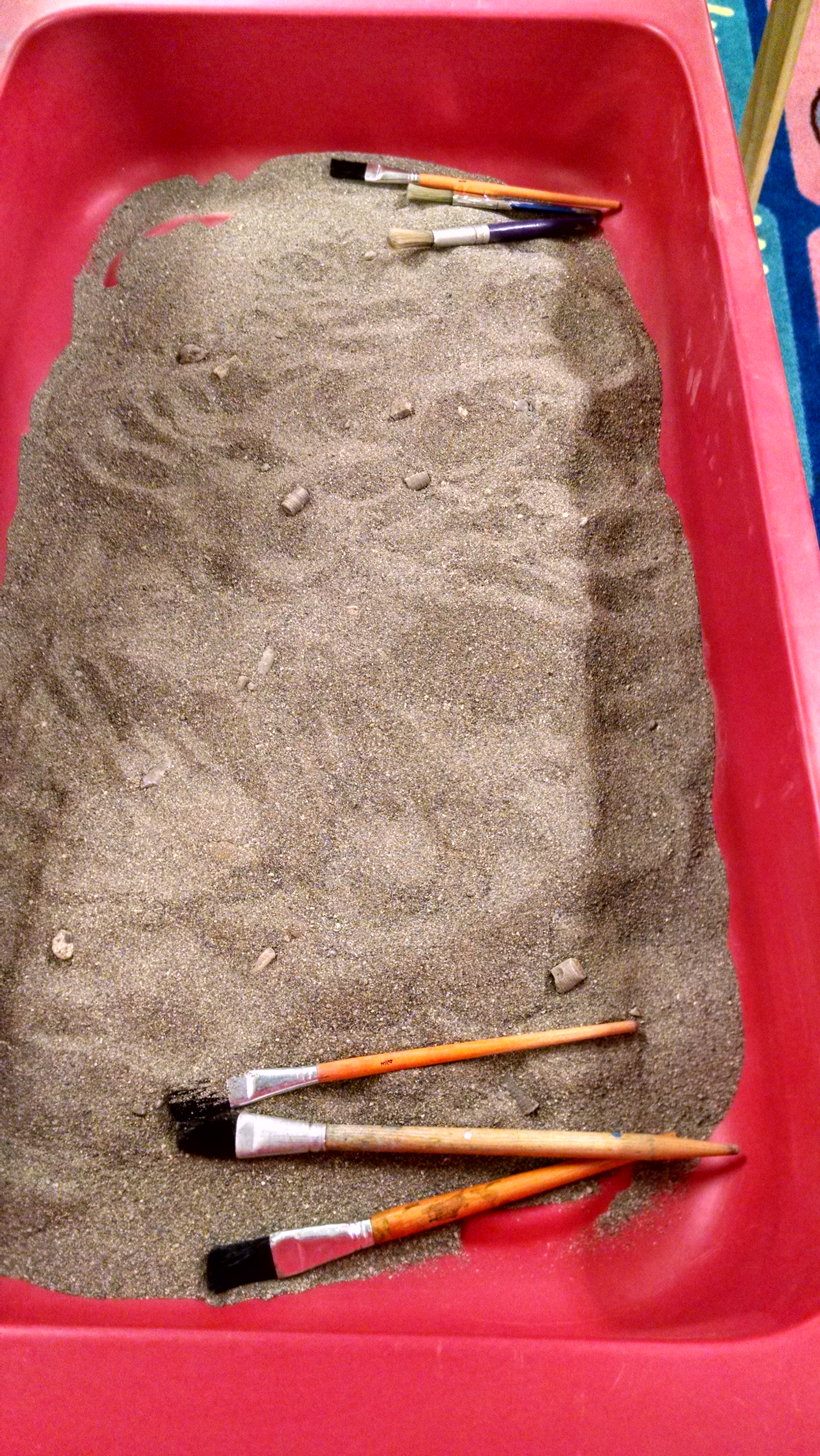 We put these in the sensory bin with sand and paintbrushes, and the identification guide on a table nearby. Our three to four year old students mostly just played in the sand. Our older kids (age 5 – 7) found and cleaned fossils and used the guide to identify some.
