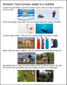 Quiz on Habitats and Adaptations. Next week, we will study Adaptations. This quiz was a preview of that… it asks questions like: “A polar bear has thick fur and fat to keep it warm in the Arctic. How would you stay warm there?” Here’s a free printable of this quiz.