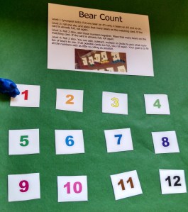 - Level 1 (youngest kids): Put one bear on #1 card, 2 bears on #2 and so on.