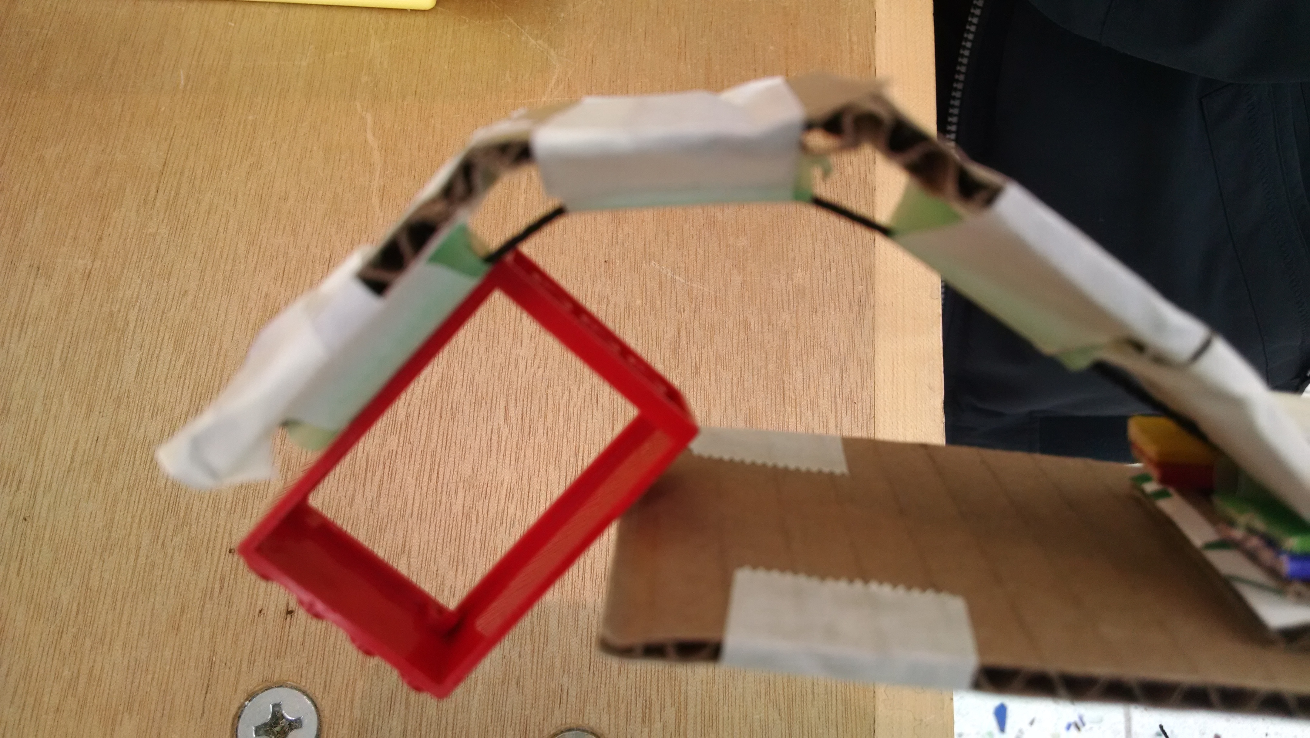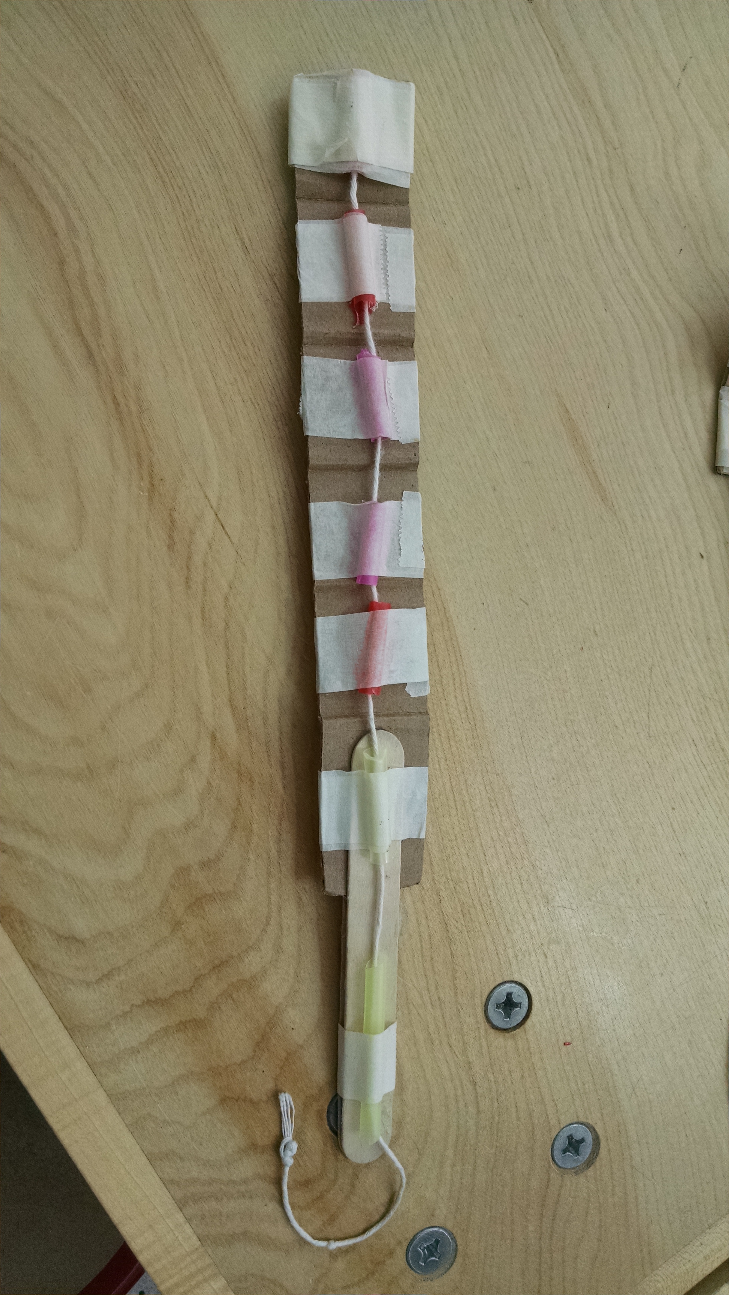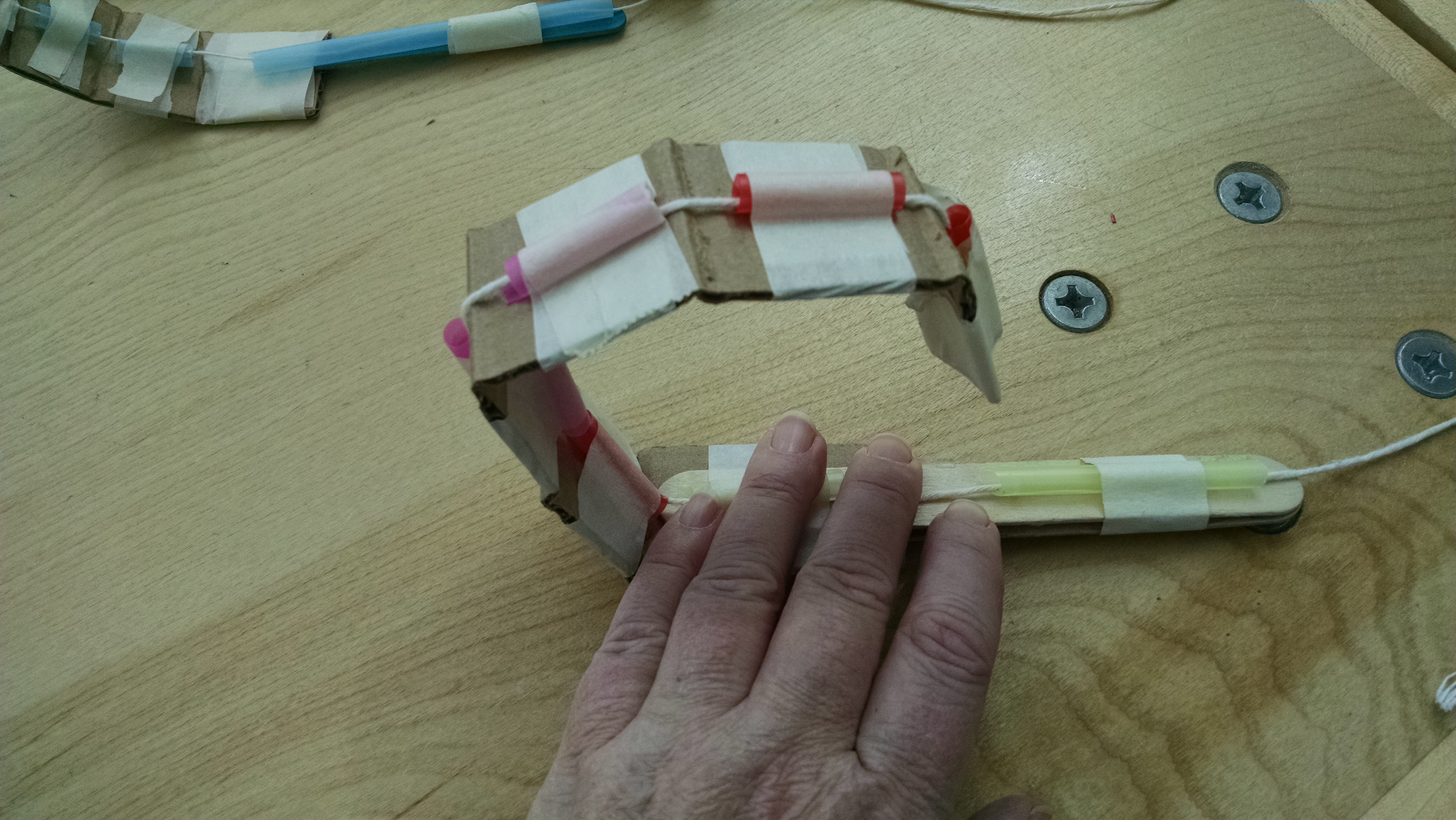 Pincer grasp: take a flat square of cardboard (whoever made this one reinforced it with a couple popsicle sticks to make sure it couldn’t fold.) Then add a couple “spacer” pieces of cardboard. Then tape on your “finger” with the straw side DOWN toward the other cardboard. (First picture.) When you pull the string, the finger curves up against the lower cardboard, forming sort of a pincer grasp. (Second picture.) It can pick up small objects like this red Lego piece.