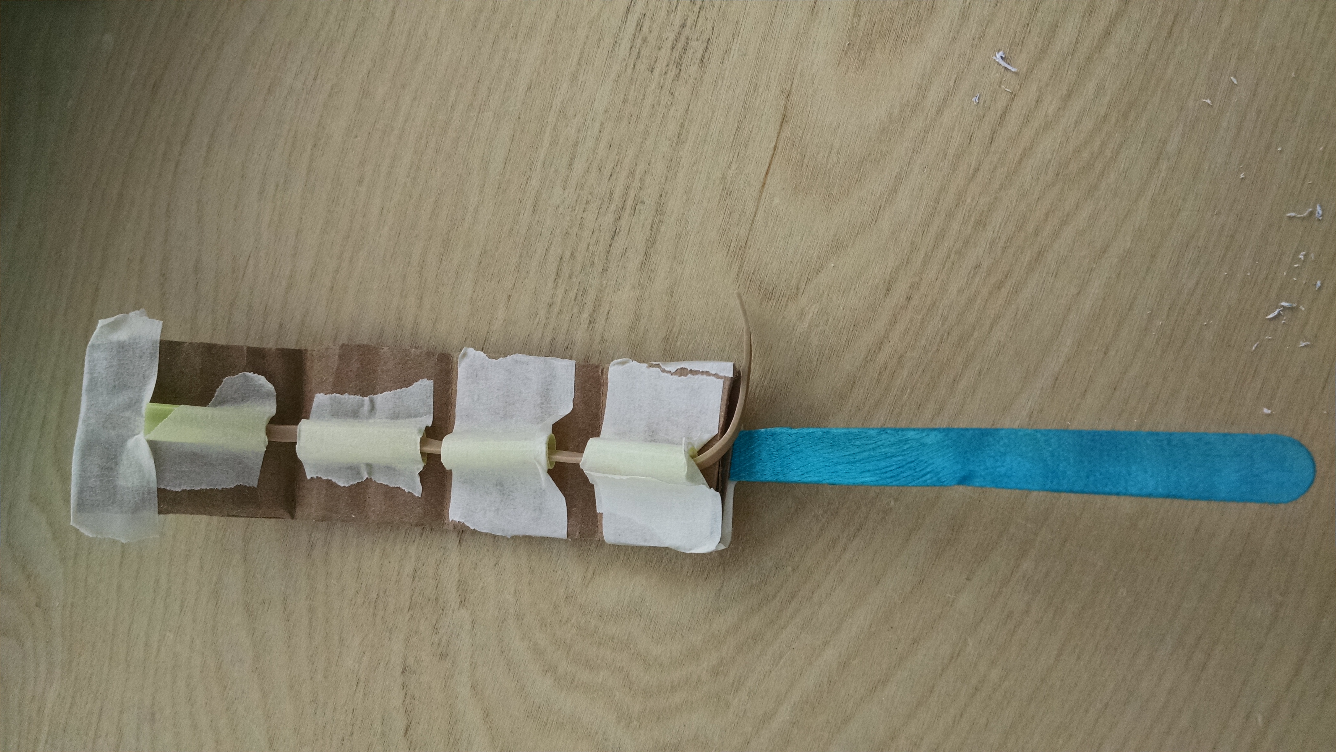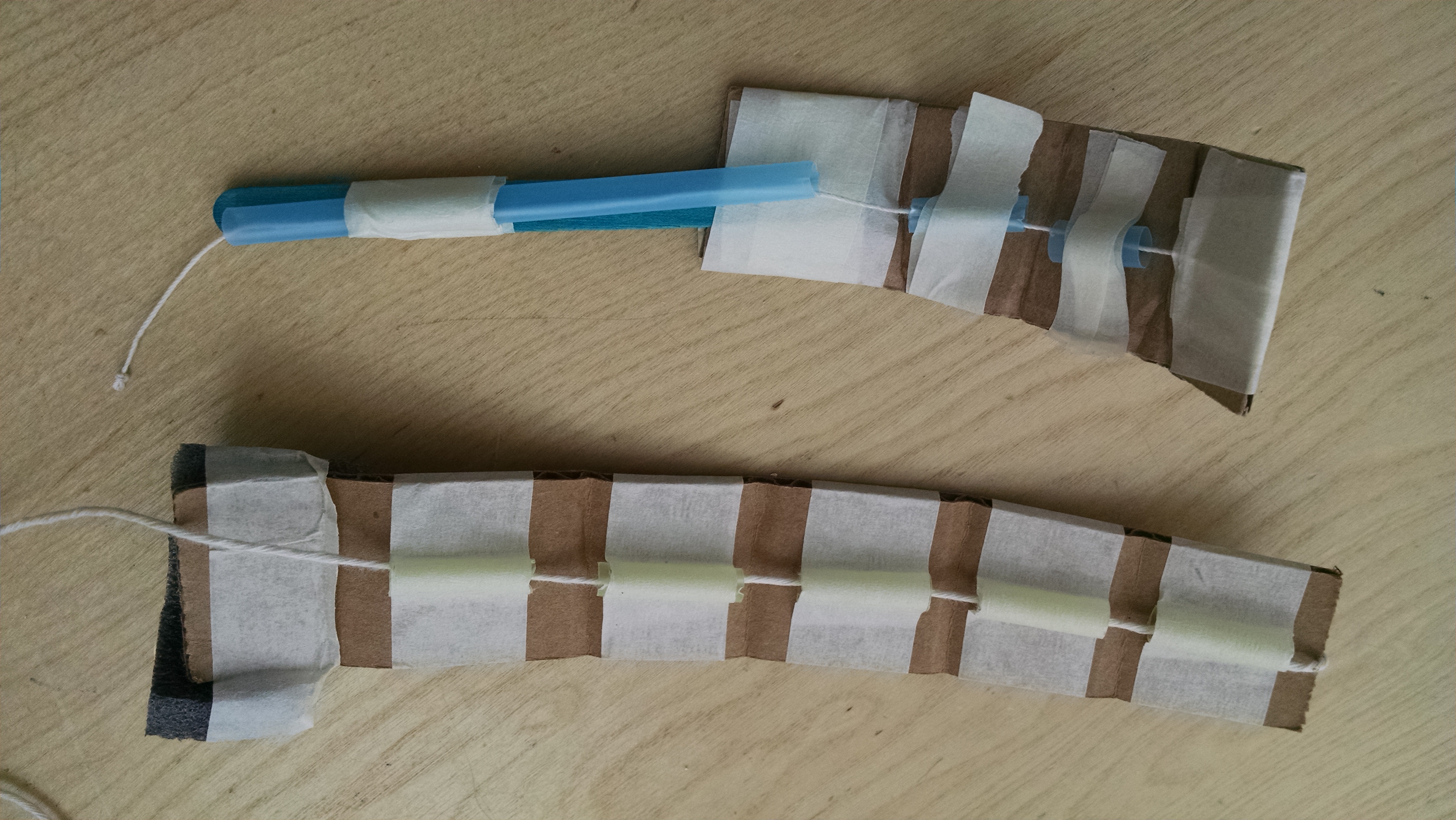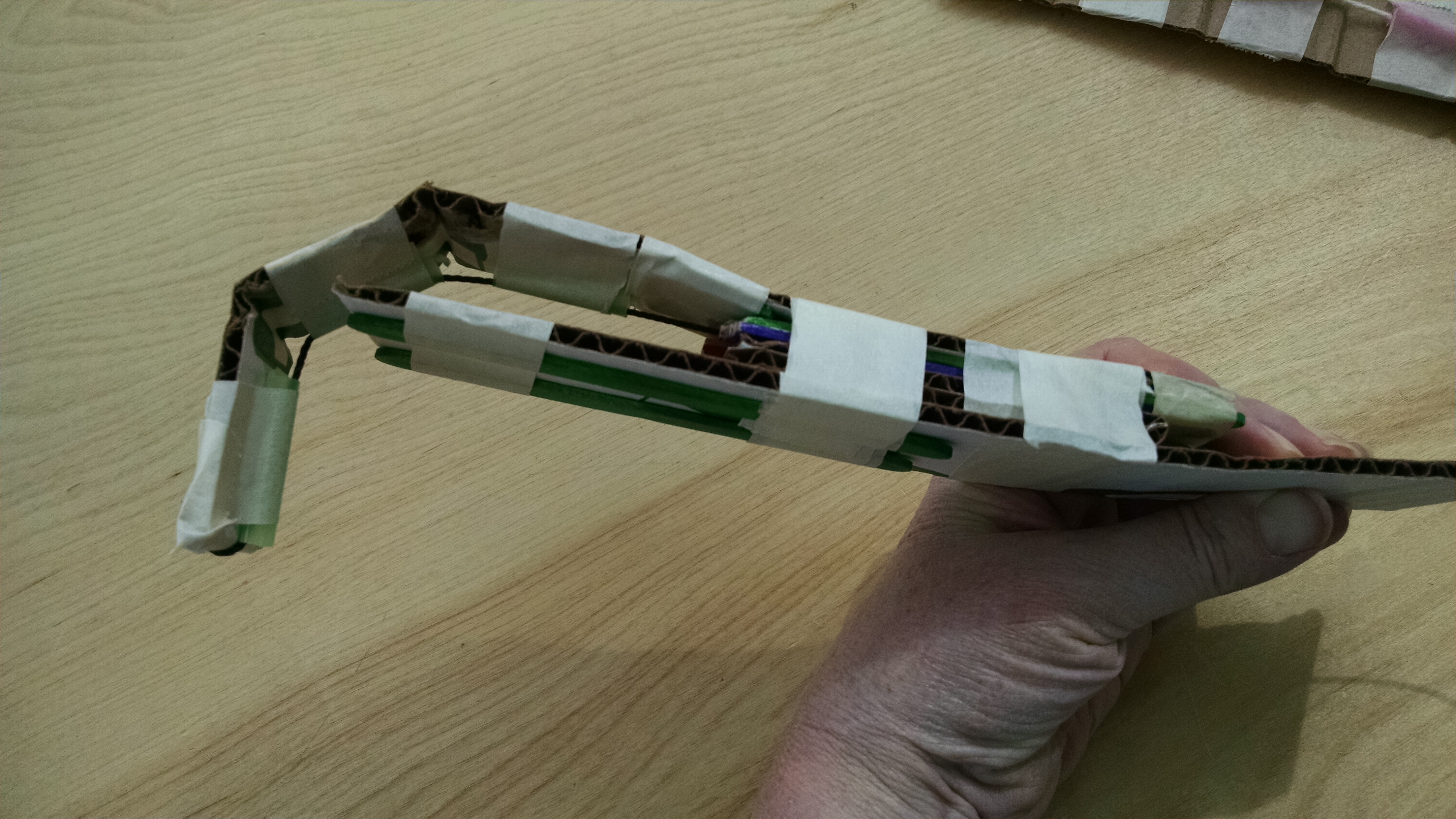 Pincer grasp: take a flat square of cardboard (whoever made this one reinforced it with a couple popsicle sticks to make sure it couldn’t fold.) Then add a couple “spacer” pieces of cardboard. Then tape on your “finger” with the straw side DOWN toward the other cardboard. (First picture.) When you pull the string, the finger curves up against the lower cardboard, forming sort of a pincer grasp. (Second picture.) It can pick up small objects like this red Lego piece.