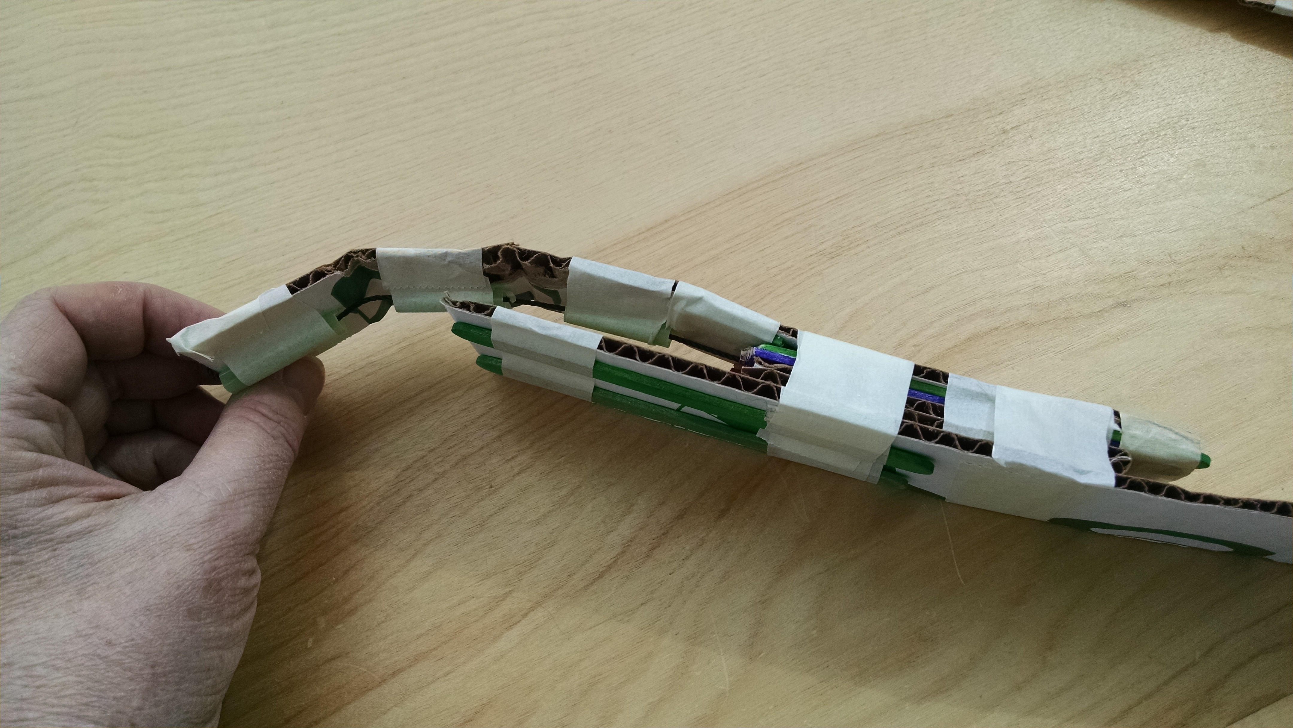 Thread a string through all the the straw segments. Tape it down at one end, and leave a loose end hanging out the other end. Pull on the loose string to bend the “finger joints.” Optional – add a handle to make it easier to hold on and pull the string.