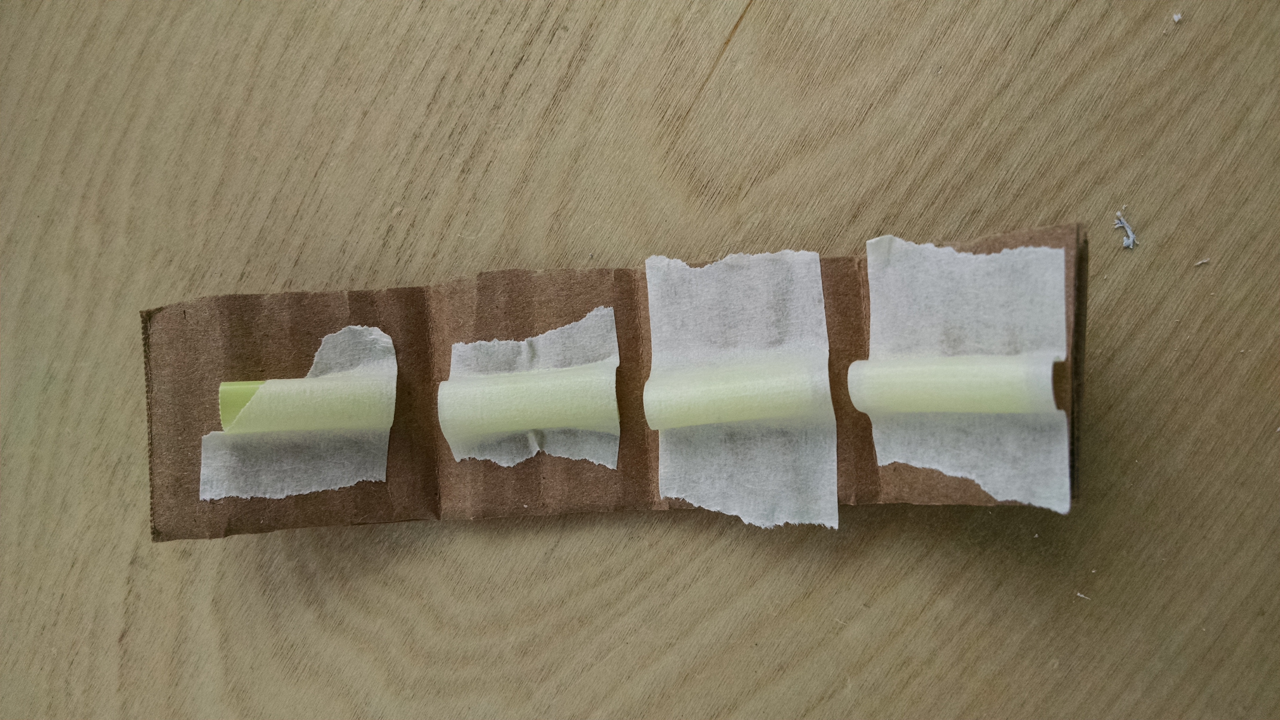 Cut short segments of plastic straw. Tape them lengthwise, one per section of the cardboard.