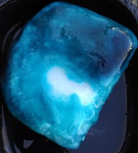 - Water droplets: Put dry ice in a tray, let kids drop water on it – the water beads up and rolls off. After you’ve done this for a while, use the tongs to flip the ice over. A layer of colored water is frozen along the bottom.