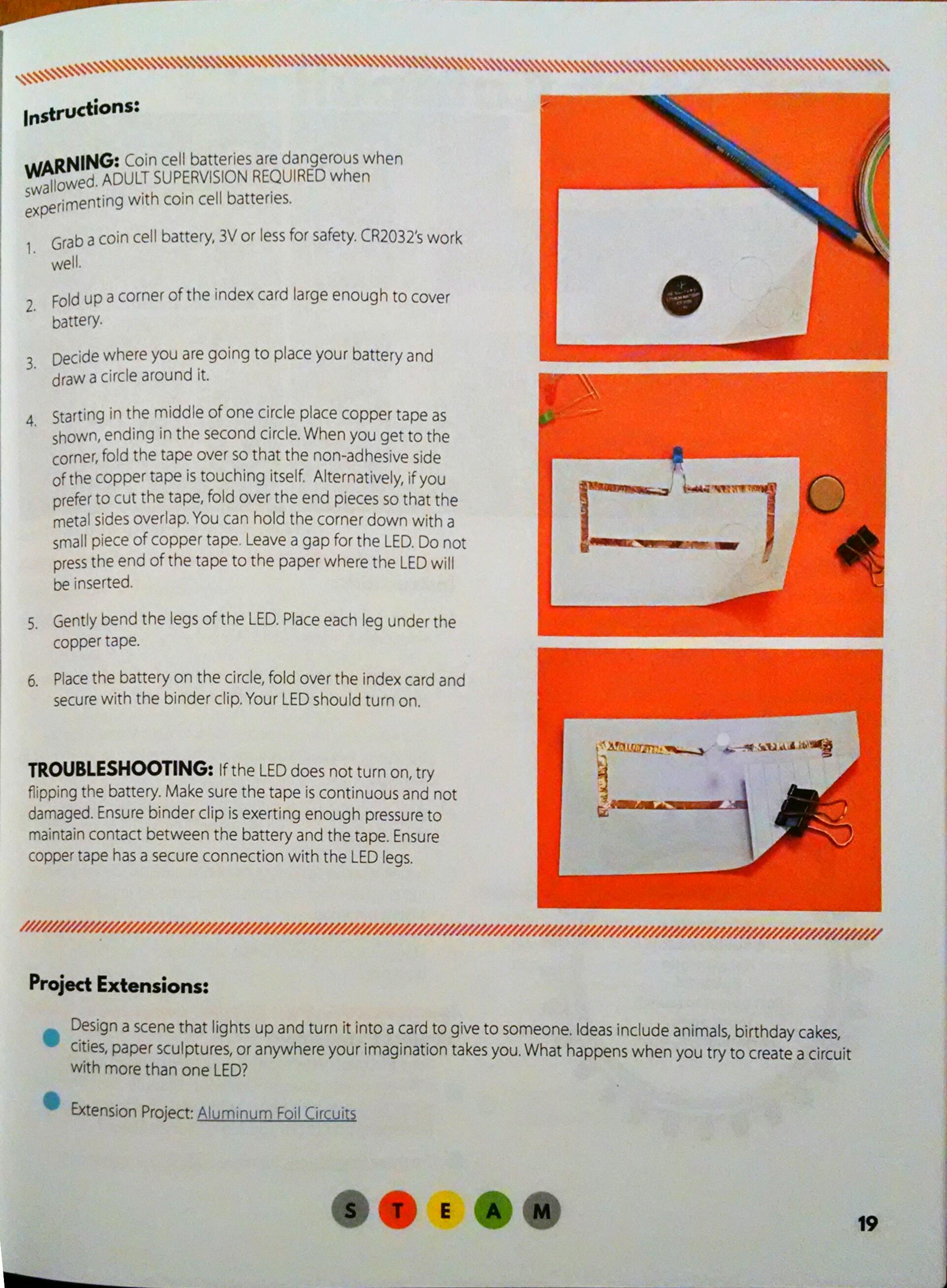“A year’s worth of captivating STEAM activities that will wow the boredom right out of kids! … STEAM Kids will inspire your children to: question like a scientist design like a technologist build like an engineer create like an artist deduce like a mathematician – and, most importantly – play like a kid! [Includes] projects like: – Rainbow Reactions – PVC Pipe Slingshot – Graffiti Art & Science – Color Changing Play Dough – Diaper Science – Circuit Bugs – Candy Mazes & so much more! Perfect for children ages 4-10, all the step-by-step activities are helpfully coded with difficulty indicators and estimated project times. Helpful project extensions promote further exploration and learning for enthusiastic children. Bonus materials will make things easy for parents and educators, and include: a handy weekly planning guide, project shopping lists, STEAM journal and more.”