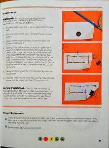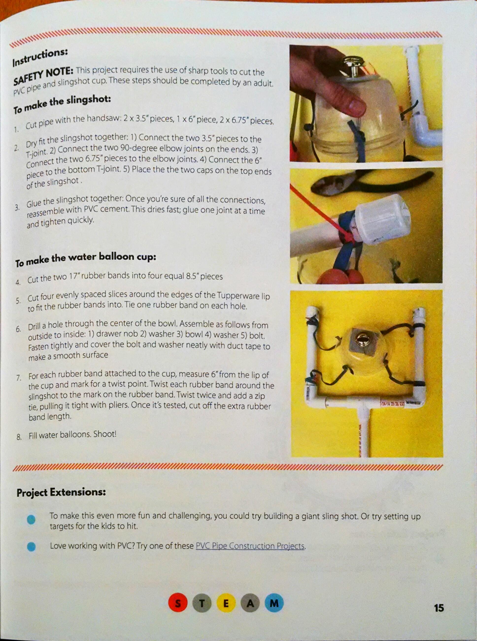 Some answers to the question “What’s the STEAM behind it?” are really good scientific explanations. Others are not as strong. For example, with the “insect hotel” of plastic straws, it doesn’t explain whether / why insects would be attracted to the plastic straws. The PVC slingshot is a great idea. But the STEAM section says “it takes trial and error to discover the most effective slingshot design.” So the STEAM only applies if you design your own slingshot, not if you follow the wonderfully detailed directions. A better STEAM concept for this project might have focused on using the slingshot once assembled – how far does it shoot – if you tweak the design will it shoot further? Gelatin science on page 75 says it’s about “the reflecting and refracting of light” but does not explain those terms.