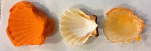 The impression of the shell is very deep, so I tried taking some shallow impressions of a cedar branch, a feather and a toy’s footprint in hopes that having a thinner layer of glue would mean they dry faster. The feather didn’t impress well or cast well – the cast kind of looked like a thumbprint. The cedar branch left a nice impression, but in the casting, it’s easier to notice the air bubbles in the glue than the cedar branch shape. The toy footprint was easy to cast and easy to see.