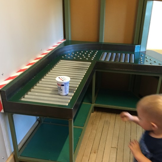 We’ve been to a lot of children’s museums and seen a lot of pretend grocery stores, and this was one of the best! There was a conveyor belt, grocery carts, well stocked shelves, fabric “baked goods” and a checkout line with a moving belt. There was a “sensory bin” of rice, with scoops and scales. The cans had labels on them so you could sort them between the ones that said “this is a fruit” and “this is a vegetable” and more.