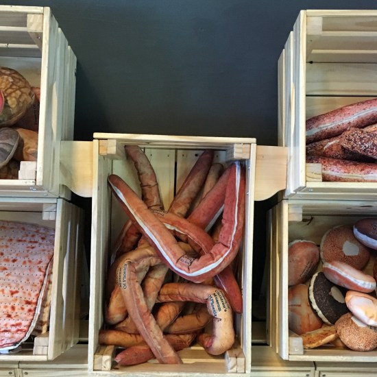 The pizza oven came with a big wooden peel so kids could lift a “pizza” out of the oven. The website says this space uses fabrics for pretend play: “green velvet for salad, scraps of silk for spaghetti.”