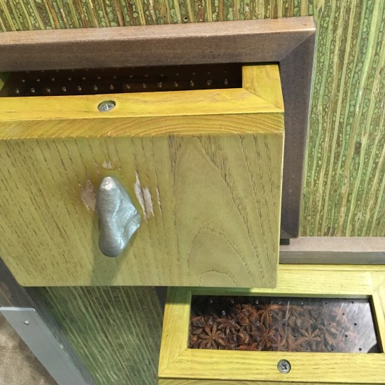 In the hallway, there were silk flowers to “plant”, and this aroma tower, where you opened drawers and smelled the aroma. (Contents included: cinnamon, cloves, star anise, lavender, fennel, and more.) There was an “ice cream stand” and a “hot dog cart” with plenty of pretend food to prepare and share.