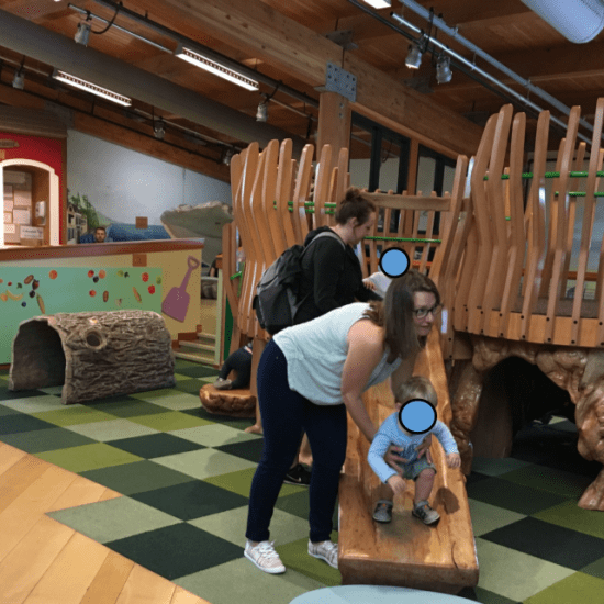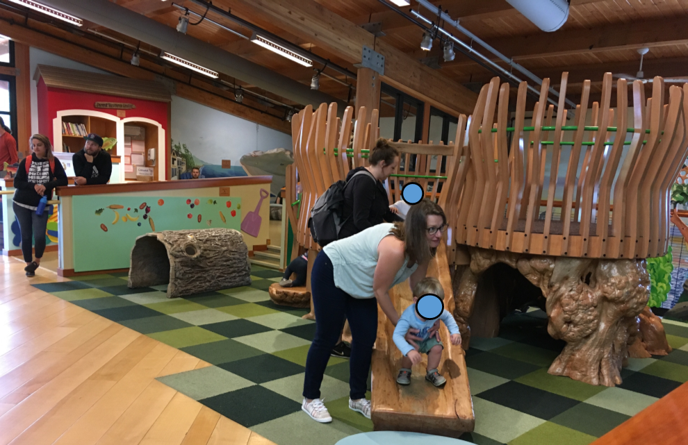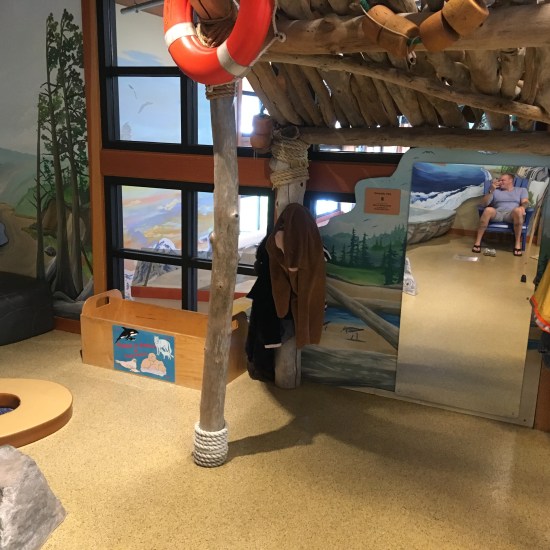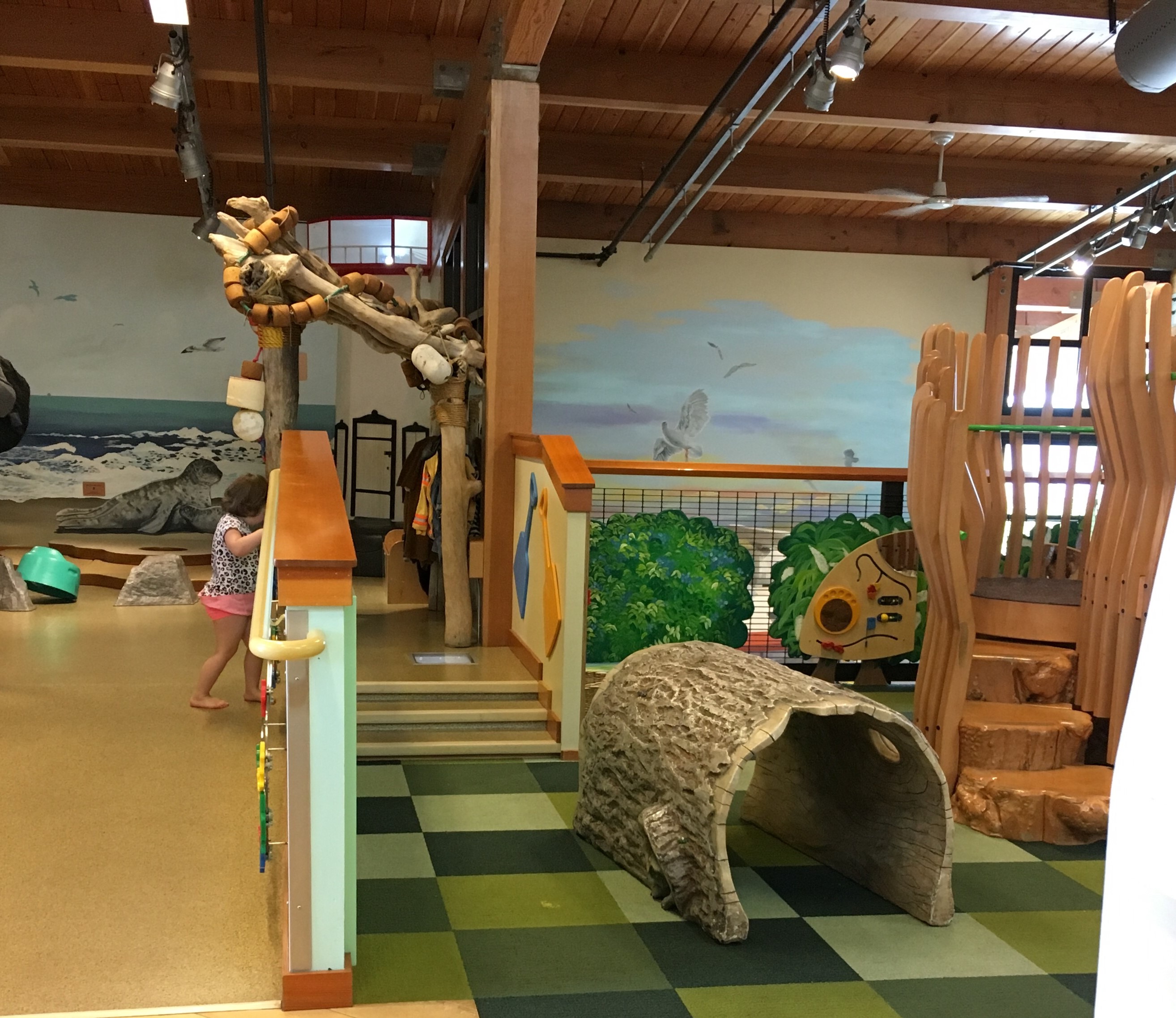 For children age 4 and under. Since we were traveling with an 8 year old, I only took a quick peek through this area. There was a climber with a slide, a train table, a beach shack with dress-up clothes, a book nook, these cool displays set down into the floor (perfect for crawling babies to discover!), a “beach” to play in, a sensory bin of lentils, play-dough, and a light table. When my son was 2 and 3, we had a membership to a local museum with a similar collection of activities, and we went every week through the rainy Northwest winter!