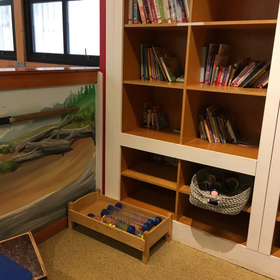 This area is decorated like you’re out in the woods. It has a camping themed pretend play area, and a reading nook.