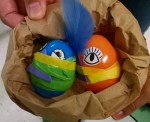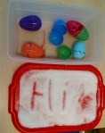 If you search online, you’ll find lots of ways that parents and teachers have re-purposed plastic eggs for pattern matching of mix and match eggs, making word family plastic eggs – http://mamateaches.com/word-family-eggs/. I think I’ve seen math problems on eggs, and you could pair up halves of toy eggs so that their facial expressions match.