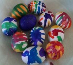 We don’t do this in class, because we’re a secular class with people from a wide variety of ethnic and religious backgrounds, and this activity is very closely associated with Easter. However, there are LOTS of great ways to color eggs, and they’re lots of fun to explore. If you ever make hard-boiled eggs to eat, you may as well decorate them! You can marble them with shaving cream, melted crayon Easter eggs, tissue paper dyed eggs, wax resist eggs, and many more.