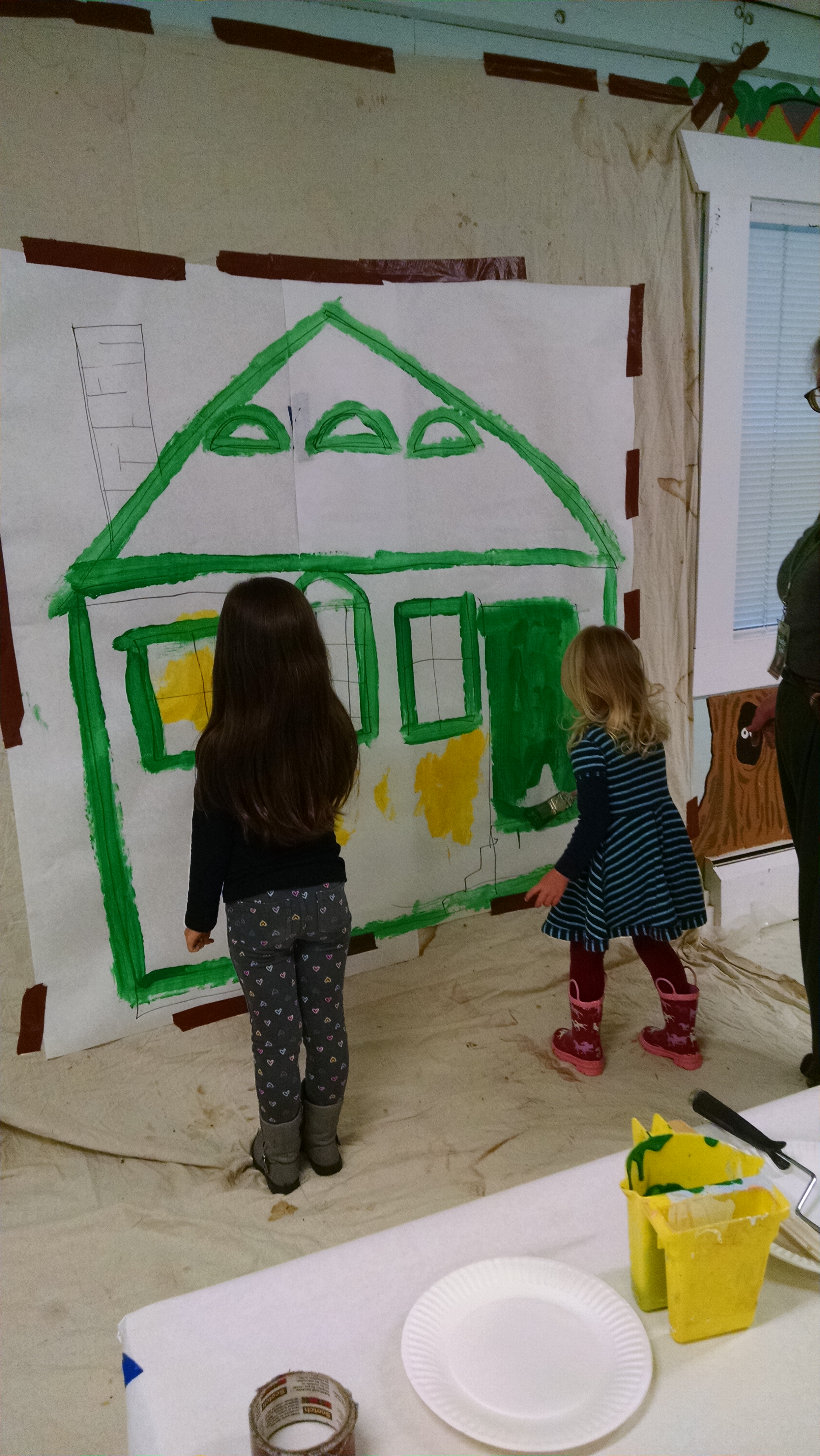 - Independent Play: Construction dress-up clothes, several hands-on activities: Paint a big house on big paper. Paint water on your own house with rollers, hammer golf tees into floral foam, wire Snap Circuits, set up “plumbing” pipes in a water table, or arrange doll house furniture on floor plans.