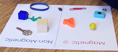 Method for 5 and up: Show them an object. Ask them whether they think the magnet will stick to it. Ask they why they think that… you’re attempting to tease out any prior knowledge they have. Ask them to make a prediction – will the magnet stick? Then test it. Were they right? Wrong? Have they learned something new about what is and what is not magnetic? As they test the items, they can put all the magnetic items in one stack and all the non-magnetic items in another stack. (You could make a sorting mat like the one from prekinders shown at the top of this post.) When you’re done, encourage them to look at each stack and see what they can observe about their results which might give them some more ideas about what magnets will and will not stick to. (e.g. everything in one pile is metal, the things in the other pile are metal or wood or plastic.)