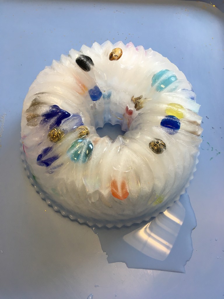 Prep: fill a big container with an inch of water. Freeze that. Then put in some toys or trinkets and another couple inches of water. Freeze that. Then another layer and another until you have a whole container of ice with cool treasure suspended in it.