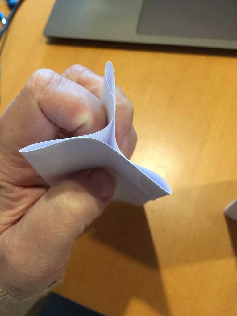 In our preschool STEM class, our first challenge is: Can you launch a pompom into the air? We offer several sample designs for launchers, and put out a wide variety of materials. Children can decide whether to build something exactly like one of our samples, or try to invent something new and original. We also challenge parents to think outside the box and create a new design. Here is a great one from one dad – a really cool launcher you can build in minutes with just one piece of paper and some tape. (And the tape is optional!)