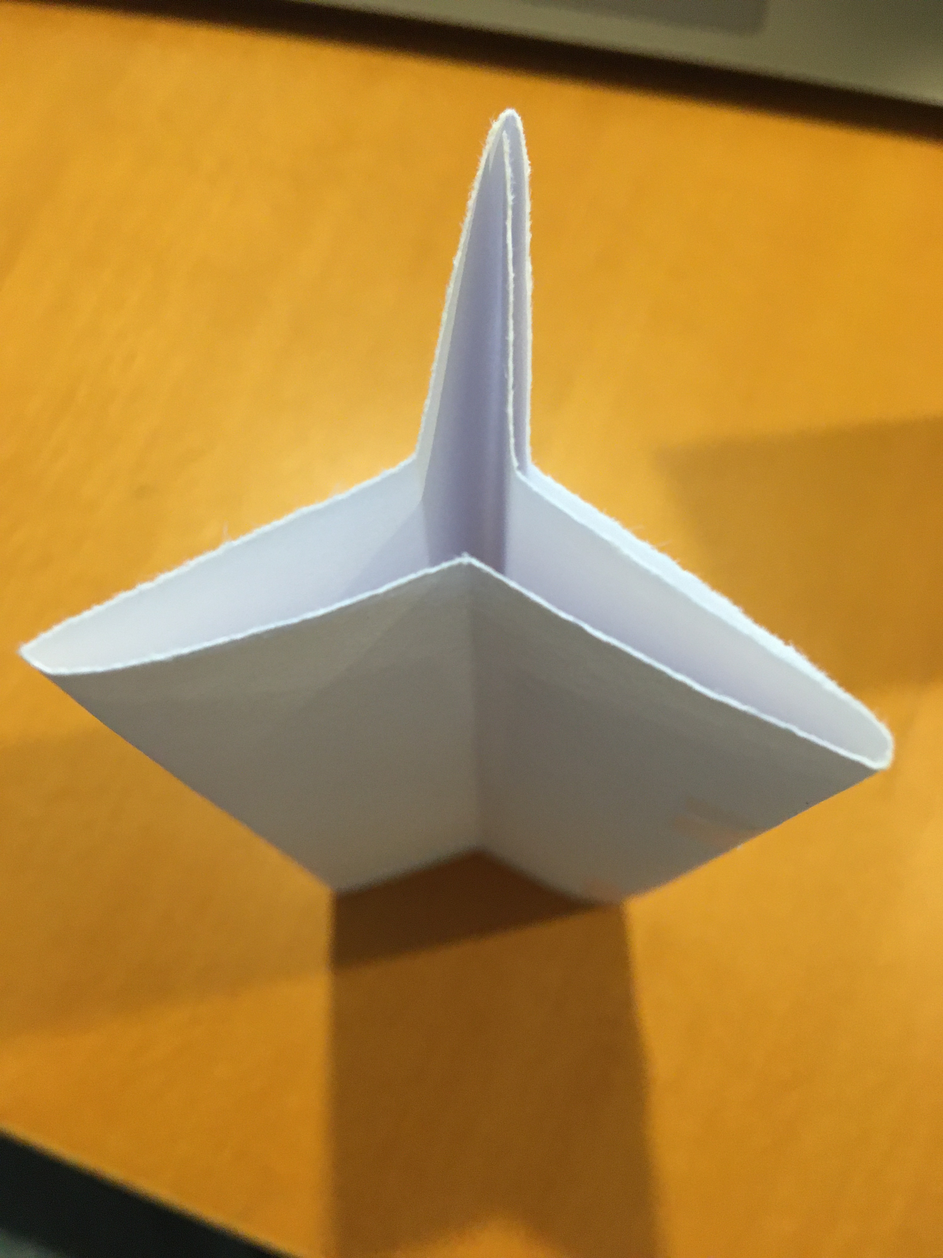 Leave one triangle as is. 7. For the other one, push the sides in to make a three pointed star. 8 & 9 Then crease it to hold that shape.