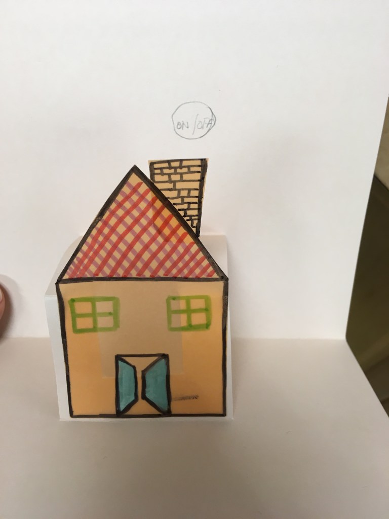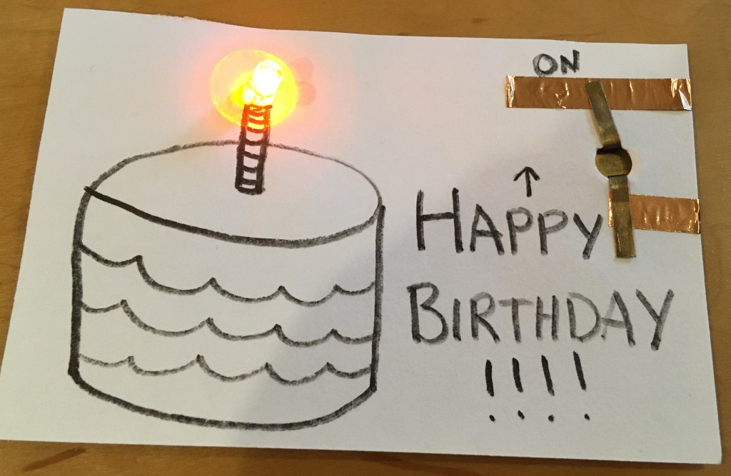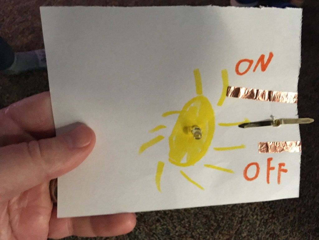 There are so many things you can do with this basic idea! One of my co-teachers combined this with our Pop-Up House project and created this idea. You fold the back of the card down to connect the horizontal strip of tape with the two vertical strips, and press on the on button to turn on the light.