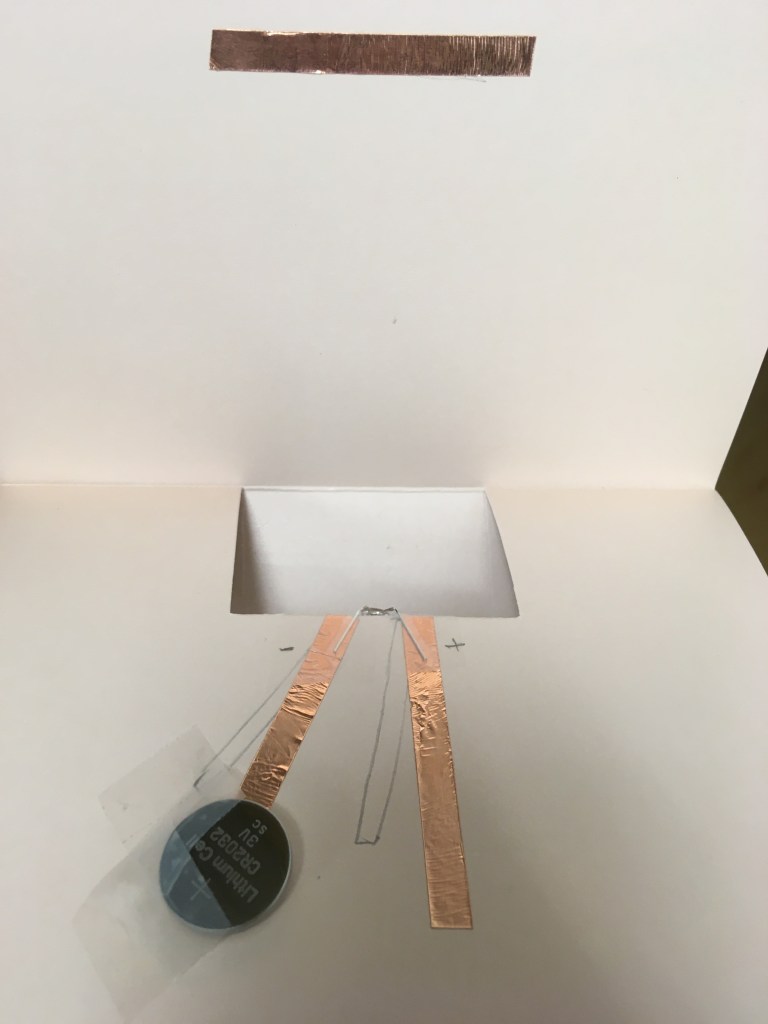 FYI: You can find our old method at https://inventorsoftomorrow.com/2021/02/05/make-a-picture-that-lights-up/. Things I don’t like about our old method: It required folding over one corner of the card, which wasn’t visually appealing, and also, because the battery had to be in a corner, sometimes it was challenging to place the drawing just right so it was easy to connect the battery. I prefer this method where you don’t have to fold the card. We also decided to create a template that showed them where to tape rather than having every family figure out their own path. The idea to add the switch was from: https://www.instructables.com/Light-Up-LED-Card/ and we decided to move the switch to the front so it was easy to see the switch and the light at the same time.