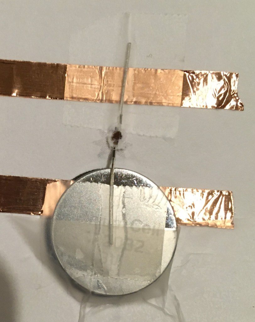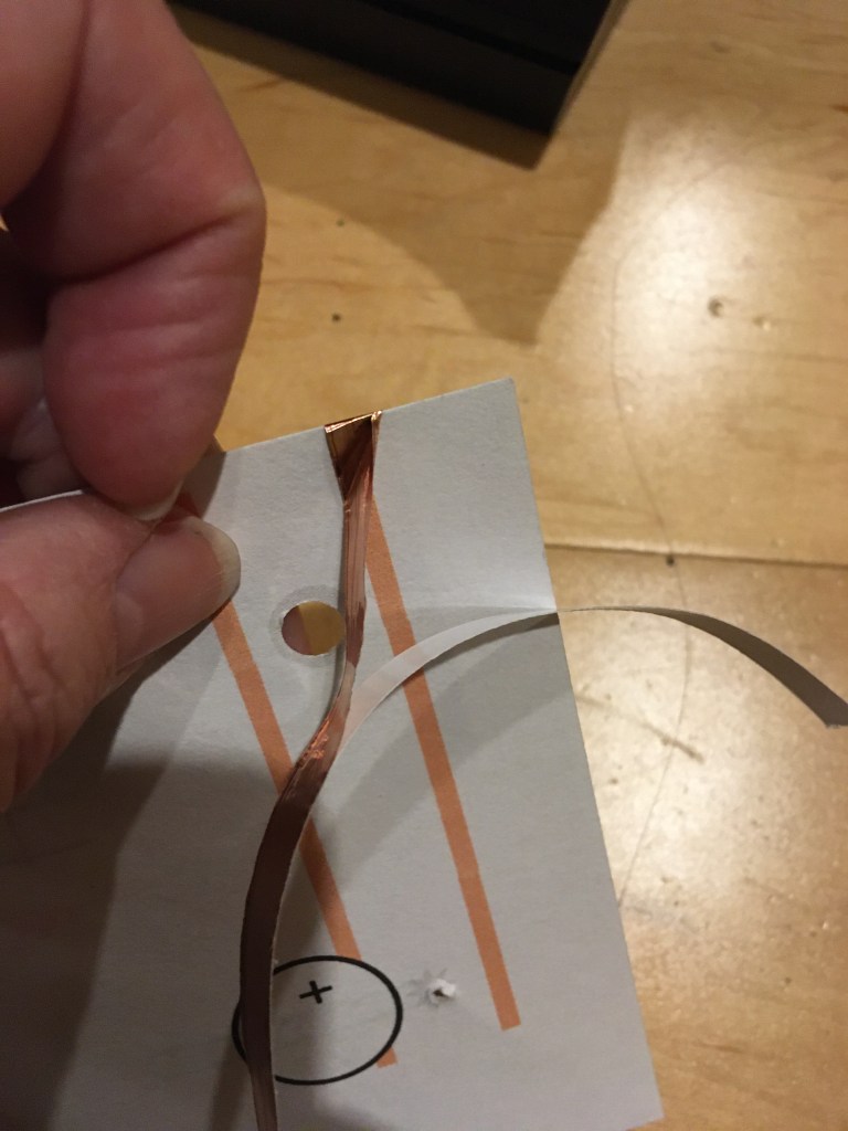 Use copper tape to cover the top orange line—start on the front and wrap it around to the back, be careful not to break or cut that piece of tape. Then use copper tape to cover the bottom orange line front to back. The two lines of tape must NOT touch each other!
