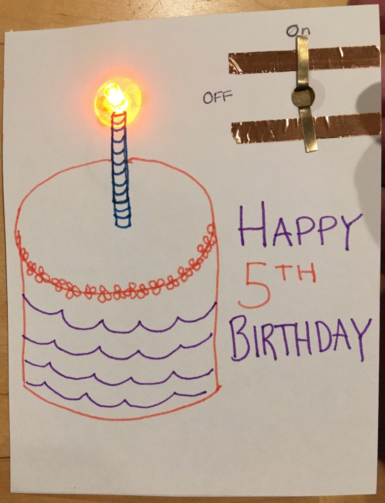 […] with electrical circuits, explore circuit building kits, and play with electrical toys and make an LED card that lights up. We explore static electricity, do some art, and learn about hydroelectricity. We have one group […]