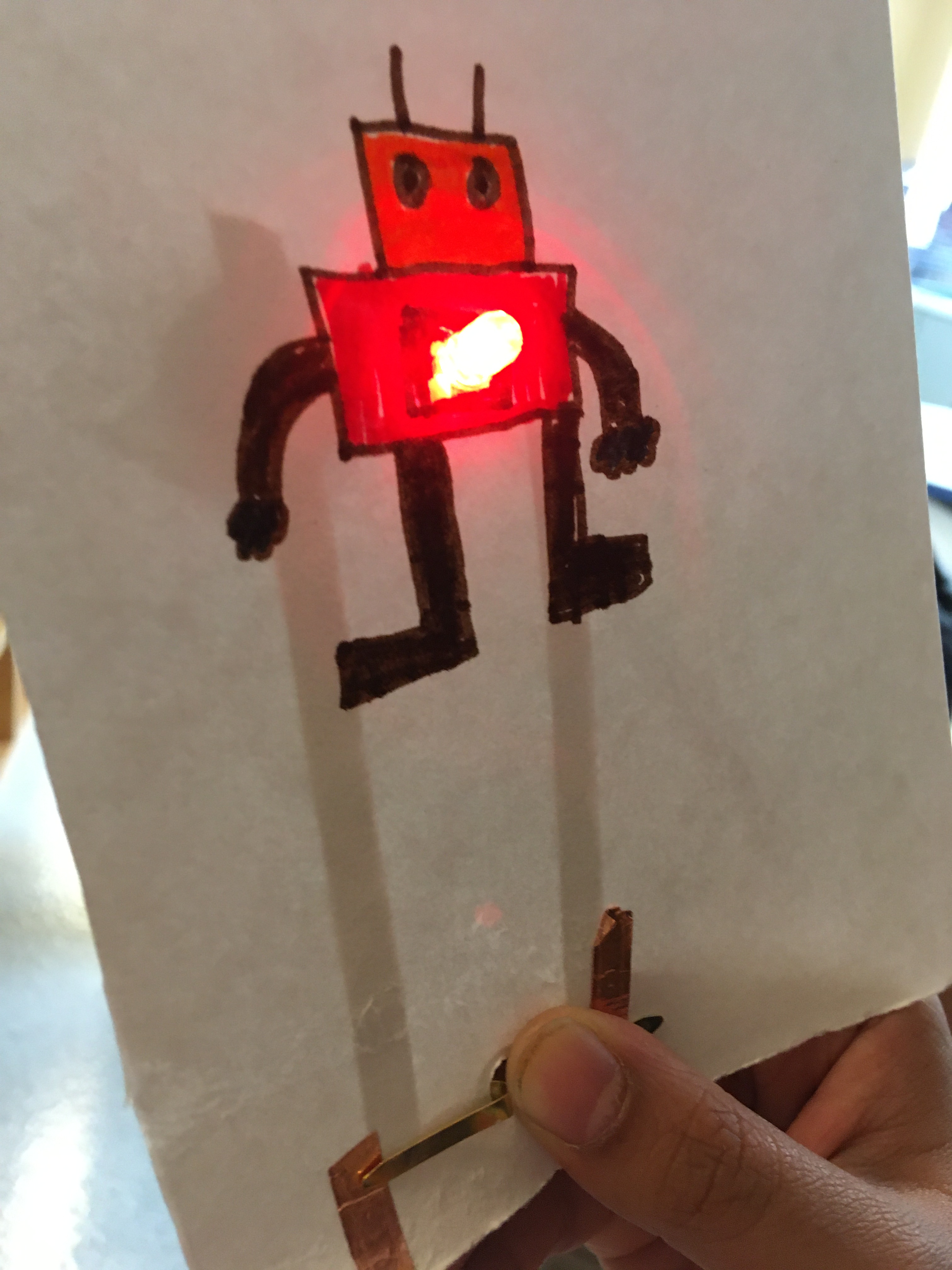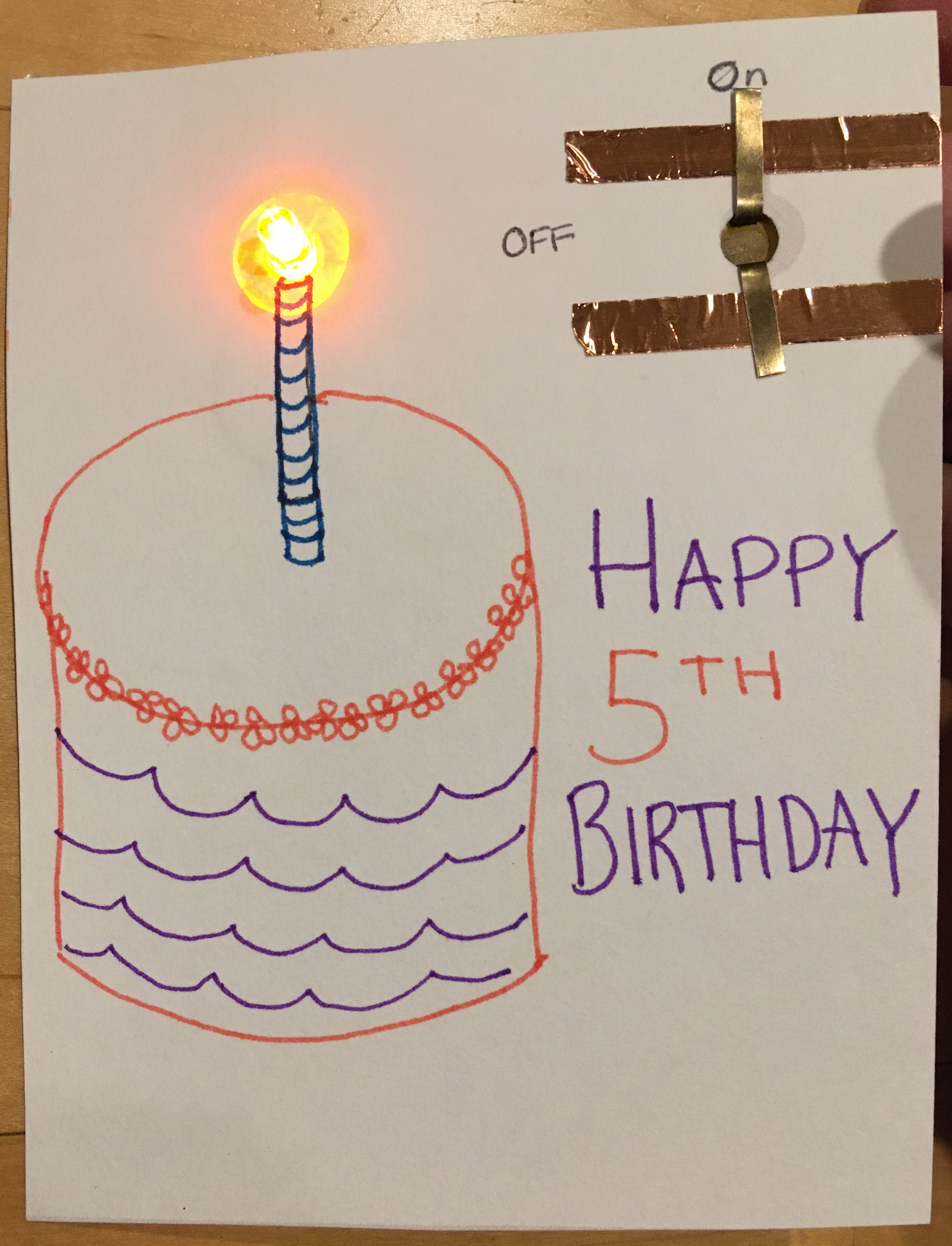 There are so many things you can do with this basic idea! One of my co-teachers combined this with our Pop-Up House project and created this idea. You fold the back of the card down to connect the horizontal strip of tape with the two vertical strips, and press on the on button to turn on the light.