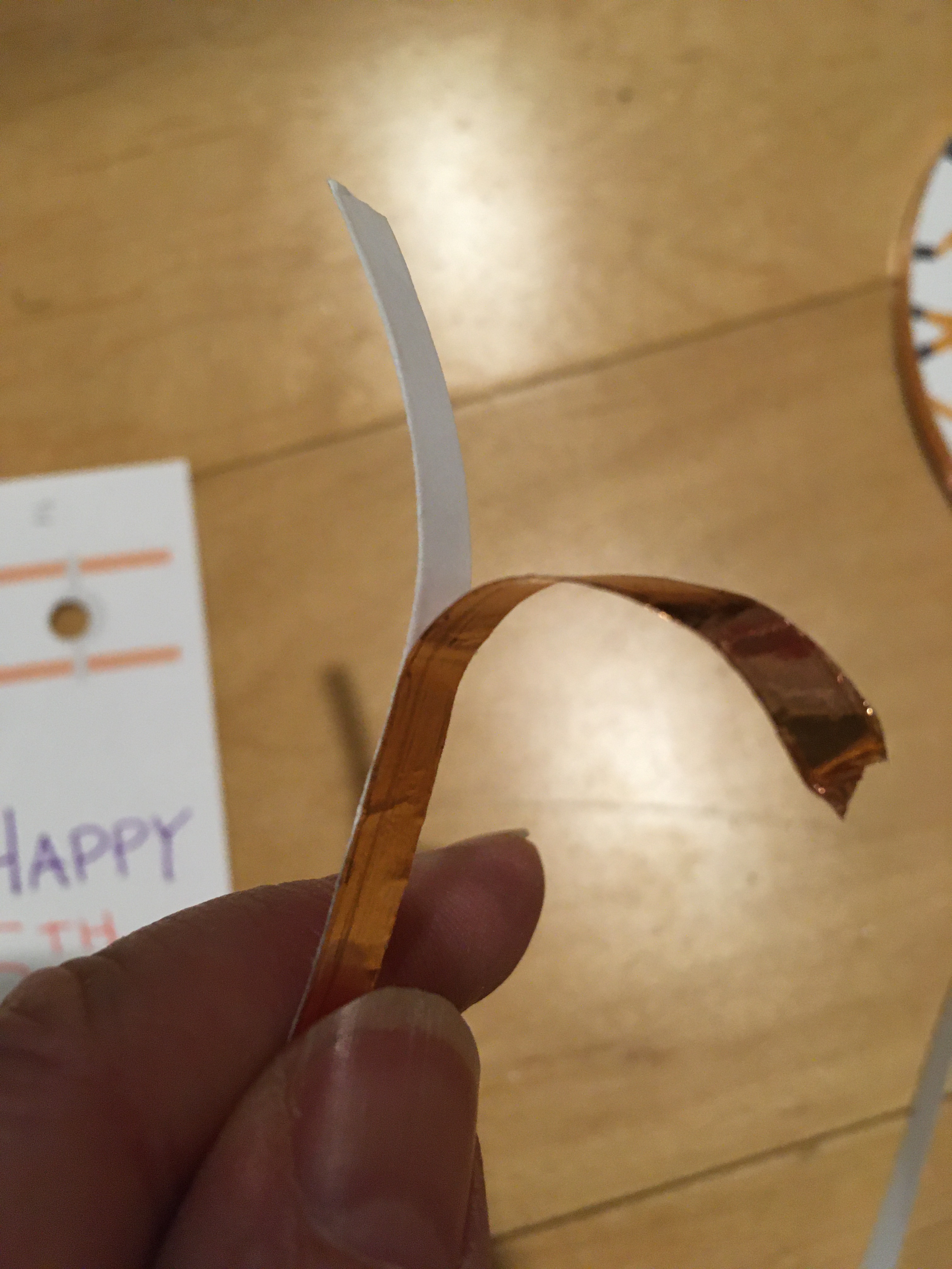 Use copper tape to cover the top orange line—start on the front and wrap it around to the back, be careful not to break or cut that piece of tape. Then use copper tape to cover the bottom orange line front to back. The two lines of tape must NOT touch each other!