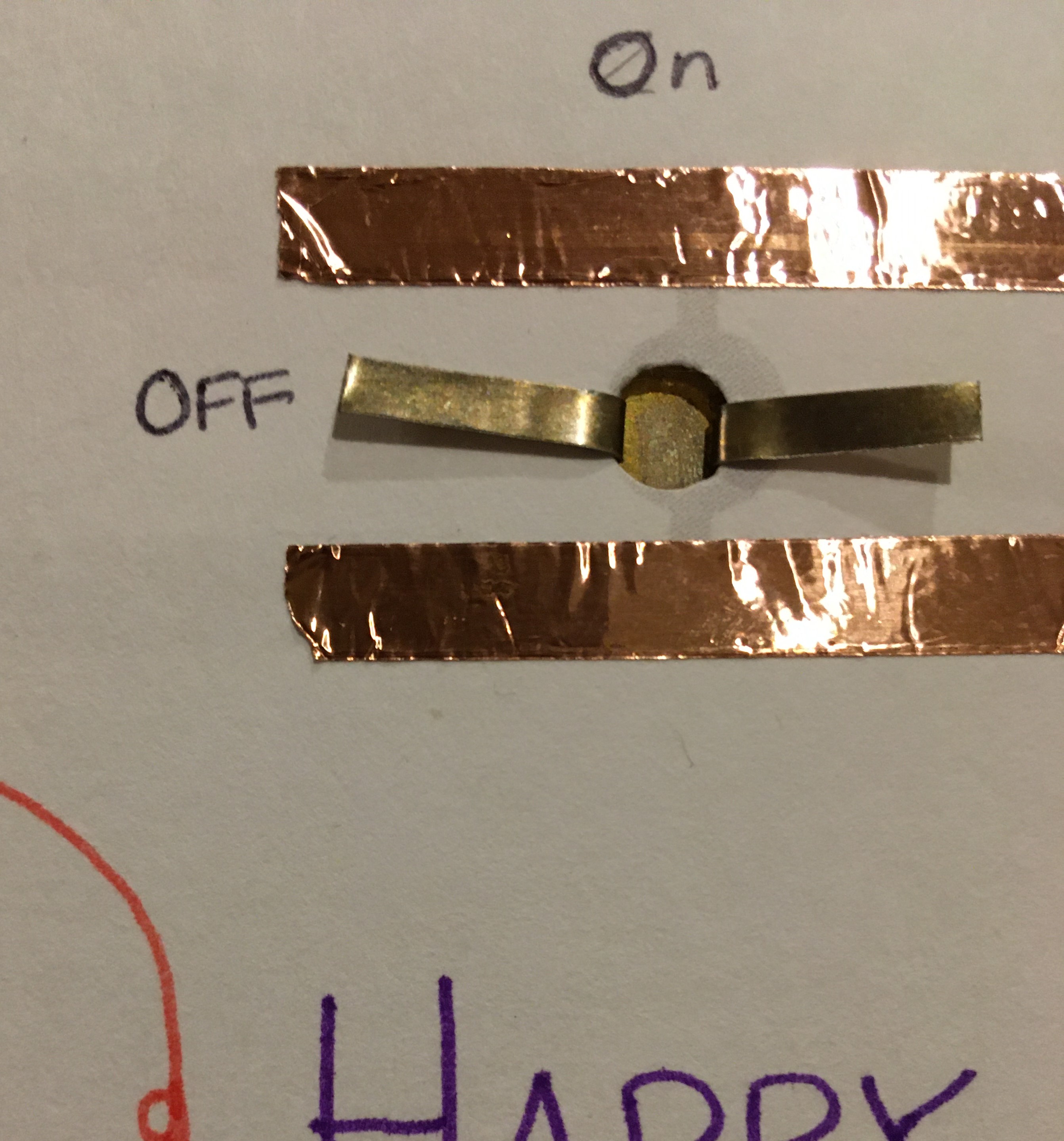 Use the hole punch to make a hole where your switch will go. Put the fastener in from the back of the card and spread its legs open flat on the front. Turn the fastener so both legs are touching copper tape. Make sure they lay flat so they have good contact with the copper. Label that as the “on” position. Then turn it so both legs are NOT touching copper tape. Label that as “off” and leave the switch in the off position for now.